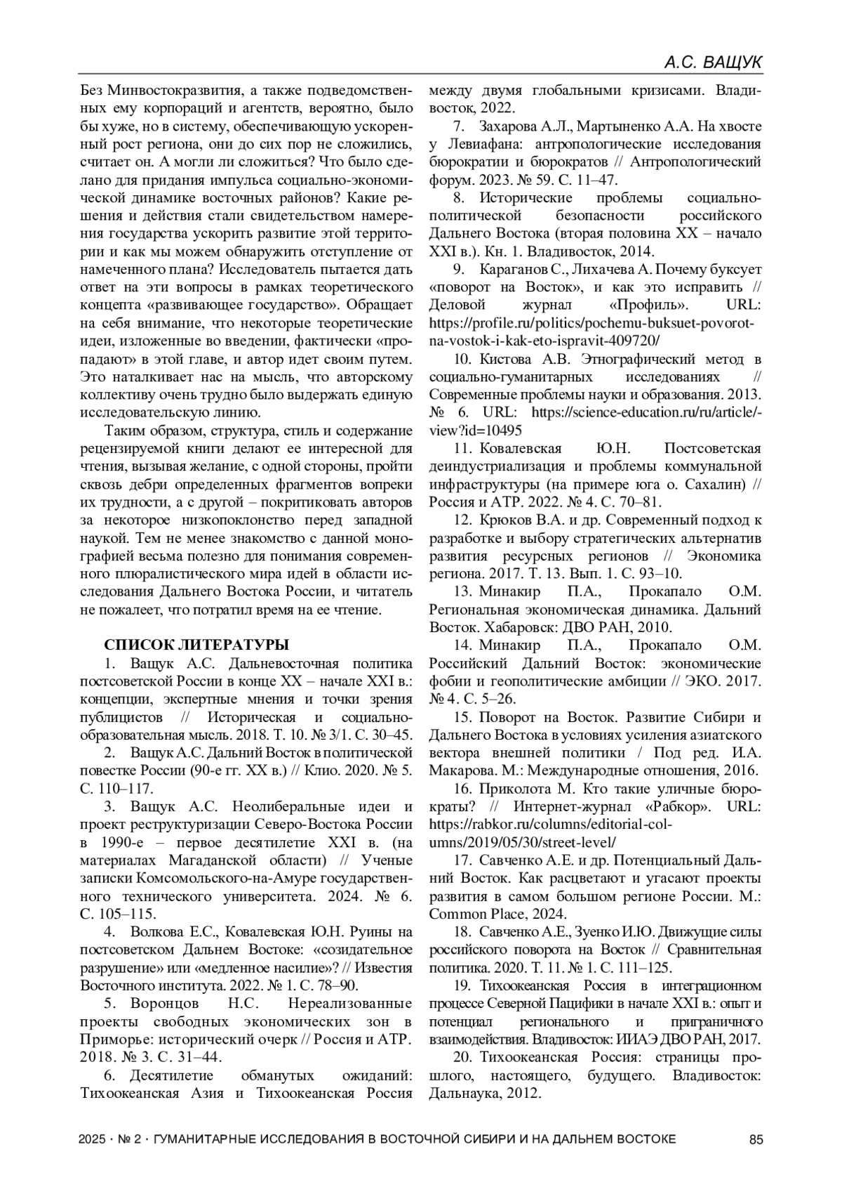 1. Ващук А.С. Дальневосточная политика постсоветской России в конце ХХ - начале ХХI в.: концепции, экспертные мнения и точки зрения публицистов // Историческая и социально-образовательная мысль. 2018. Т. 10. № 3/1. С. 30-45.