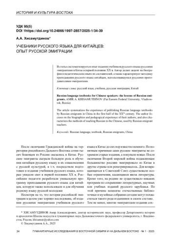 После окончания Гражданской войны на территории российского Дальнего Востока сотни тысяч беженцев из России оказались в Китае. Русские эмигранты сыграли большую роль в обучении китайцев русскому языку и их ознакомлении с русской культурой, в т. ч. посредством подготовки и издания учебников русского языка, которые увидели свет в первой половине XX в. Российские педагоги разработали уникальную программу преподавания русского языка для китайцев, которую также использовали и для обучения родному языку русской молодежи