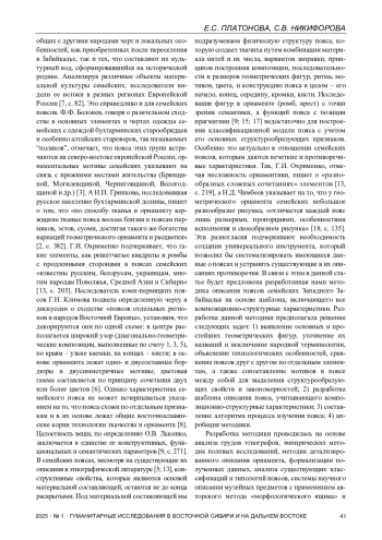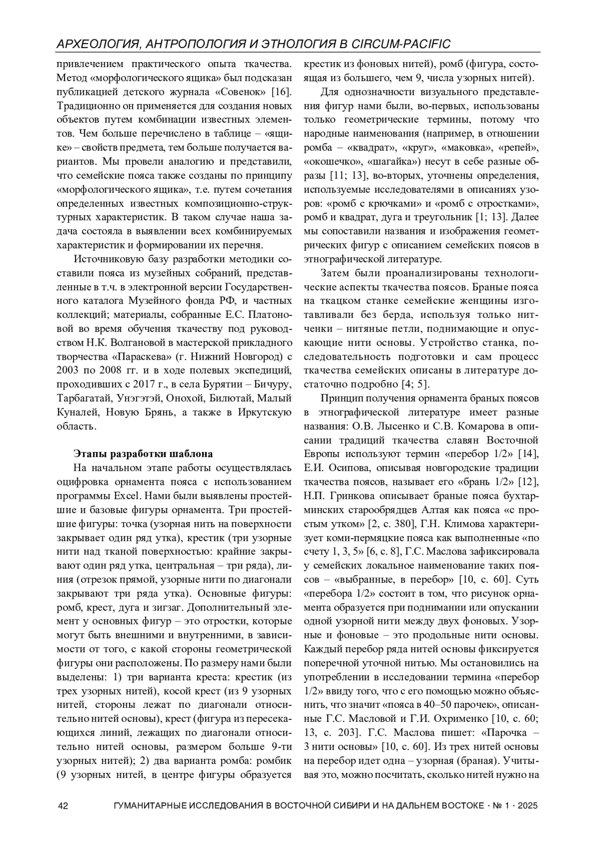 Сохранение этнокультурной самобытности народов является одной из приоритетных задач государства. Это особенно важно для таких групп, как семейские Забайкалья, чья история включает в себя множество перемещений и взаимодействий с разными культурами. Уникальность культурной идентичности семейских заключается в сочетании общих с другими народами черт и локальных особенностей, как приобретенных после переселения в Забайкалье, так и тех, что составляют их культурный код, сформировавшийся на исторической родине. Анализируя различные объекты материальной культуры семейских, исследователи видели ее истоки в разных регионах Европейской России [7, с. 82]. Это справедливо и для семейских поясов. Ф. Ф. Болонев, говоря о разительном сходстве в основных элементах и чертах одежды семейских с одеждой бухтарминских старообрядцев и особенно алтайских староверов, так называемых “поляков”, отмечает, что пояса этих групп встречаются на северо-востоке европейской России, орнаментальные мотивы семейских указывают на связь с прежними местами жительства (Брянщиной, Могилевщиной, Черниговщиной, Вологодщиной и др.) [3]. А Н. П. Гринкова, исследовавшая русское население бухтарминской долины, пишет о том, что «по способу тканья и орнаменту кержацкие тканые пояса весьма близки к поясам пермяков, эстов, суоми, достигая такого же богатства вариаций геометрического орнамента и расцветки» [2, с. 382]. Г. И. Охрименко подчеркивает, что такие элементы, как решетчатые квадраты и ромбы с продленными сторонами в поясах семейских «известны русским, белорусам, украинцам, многим народам Поволжья, Средней Азии и Сибири» [13, с. 203]. Исследователь коми-пермяцких поясов Г. Н. Климова подвела определенную черту в дискуссии о сходстве «поясов отдельных регионов и народов Восточной Европы», установив, что декорируются они по одной схеме: в центре располагается широкий узор (диагонально-геометрические композиции, выполненные по счету 1, 3, 5), по краям – узкие каемки, на концах – кисти; в основе орнамента лежат одно- и двусоставные бордюры и двусимметричные мотивы; цветовая гамма составляется по принципу сочетания двух или более цветов [6]. Однако характеристика семейского пояса не может исчерпываться указанием на то, что пояса схожи по отдельным признакам и в их основе лежат общие восточнославянские корни технологии ткачества и орнамента [8]. Целостность вещи, по определению О. В. Лысенко, заключается в единстве ее конструктивных, функциональных и семантических параметров [9, с. 271]. В семейских поясах, несмотря на существующие их описания в этнографической литературе [5; 13], конструктивные свойства, которые являются основой материальной составляющей, остаются не до конца раскрытыми. Под материальной составляющей мы подразумеваем физическую структуру пояса, которую создает ткачиха путем комбинации материала нитей и их числа, вариантов заправки, принципов построения композиции, последовательности и размеров геометрических фигур, ритма, мотивов, цвета, и конструкцию пояса в целом – его начало, конец, середину, кромки, кисти. Исследования фигур в орнаменте (ромб, крест) с точки зрения семантики, а функций пояса с позиции прагматики [9; 15; 17] недостаточно для построения классификационной модели пояса с учетом его основных структурообразующих признаков. Особенно это актуально в о