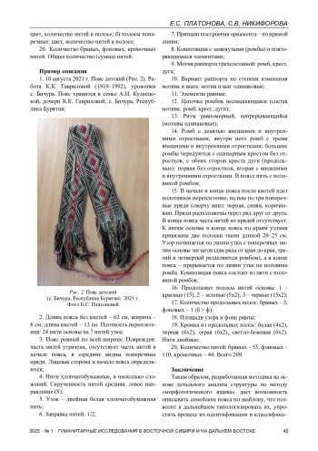 В статье представлена разработанная авторами методика описания браных поясов группы старообрядцев – семейских Западного Забайкалья. Помимо шаблона, позволяющего учесть широкий перечень композиционно-структурных характеристик пояса, авторы предлагают алгоритм процесса его изучения, а также пример описания конкретного пояса. Унифицированное описание поясов по данной методике позволит типологизировать их, упростить процесс их идентификации и классификации, а также облегчит разработку новых моделей для аналогичных исследований.