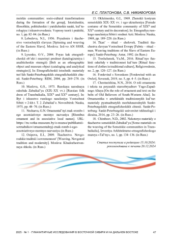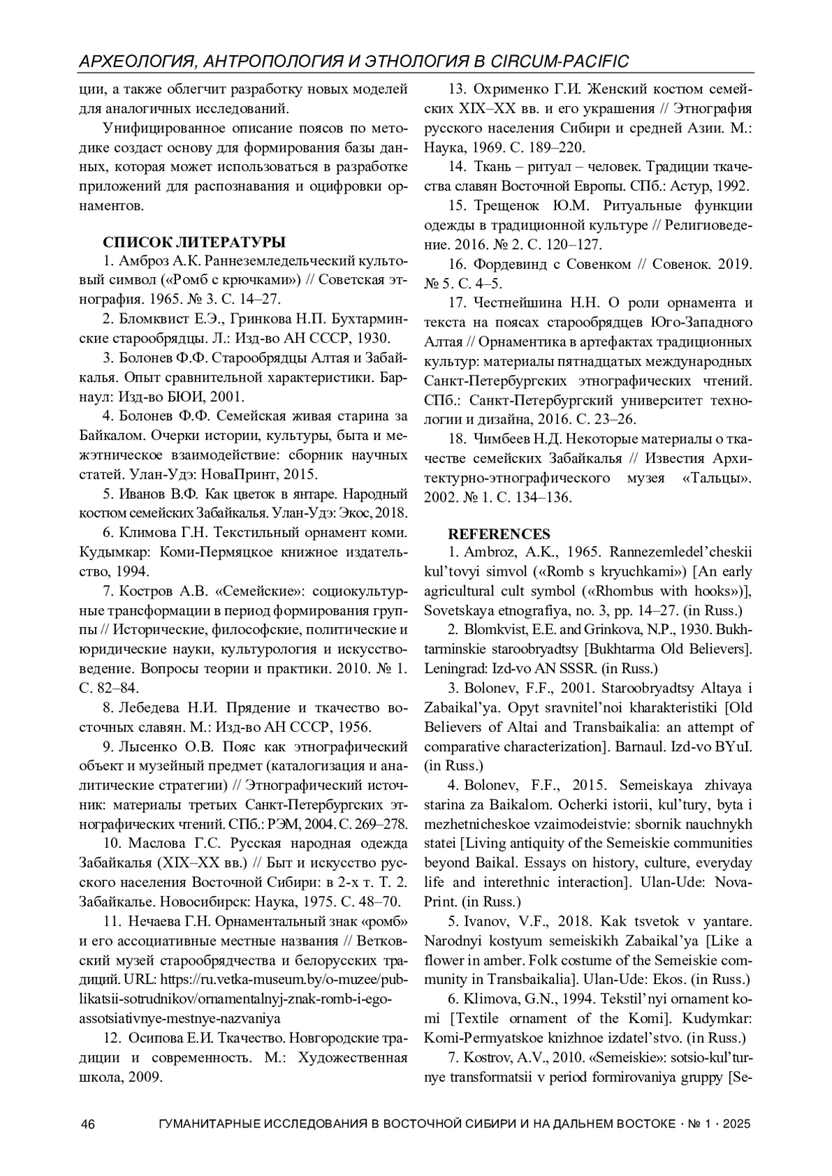 13. Охрименко Г.И. Женский костюм семейских XIX-XX вв. и его украшения // Этнография русского населения Сибири и средней Азии. М.: Наука, 1969. С. 189-220.