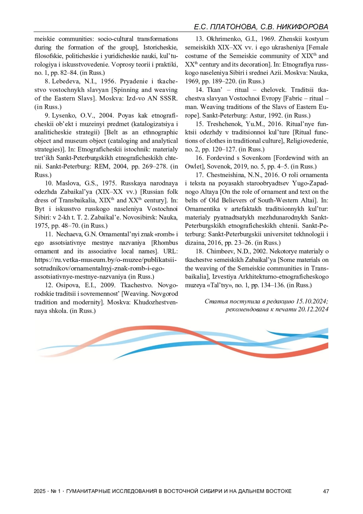 18. Чимбеев Н.Д. Некоторые материалы о ткачестве семейских Забайкалья // Известия Архитектурно-этнографического музея “Тальцы”. 2002. № 1. С. 134-136.