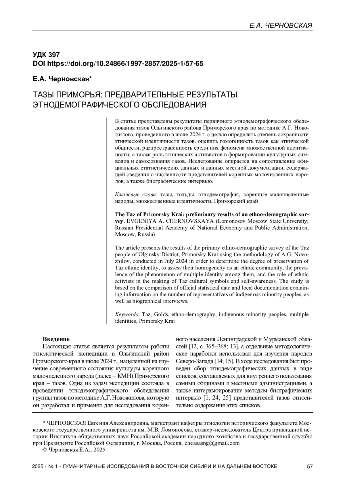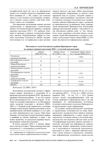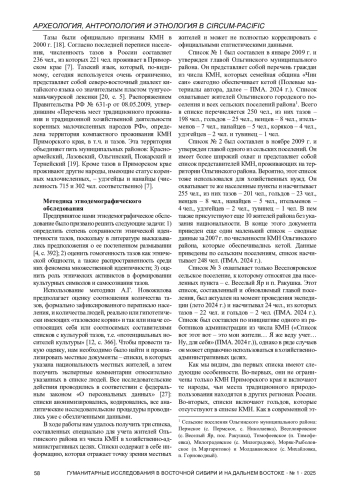 Настоящая статья является результатом работы этнологической экспедиции в Ольгинский район Приморского края в июле 2024 г., нацеленной на изучение современного состояния культуры коренного малочисленного народа (далее – КМН) Приморского края – тазов. Одна из задач экспедиции состояла в проведении этнодемографического обследования группы тазов по методике А. Г. Новожилова, которую он разработал и применял для исследования коренного населения Ленинградской и Мурманской областей [12, с. 365–368; 13], а отдельные методологические наработки использовал для изучения народов Северо-Запада [14; 15]. В ходе исследования был проведен сбор этнодемографических данных в виде списков, составляемых для внутреннего пользования самими общинами и местными администрациями, а также интервьюирование методом биографических интервью [1; 24; 25] представителей тазов относительно содержания этих списков.