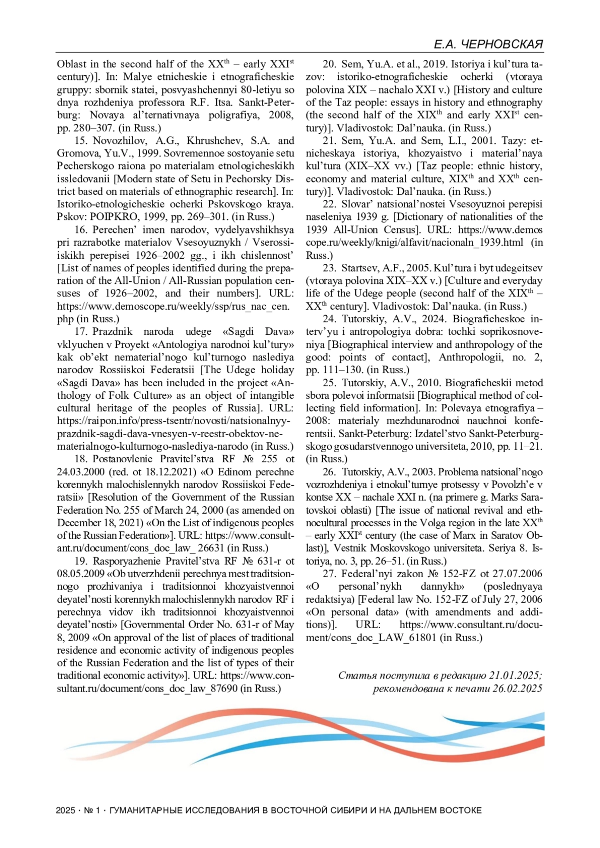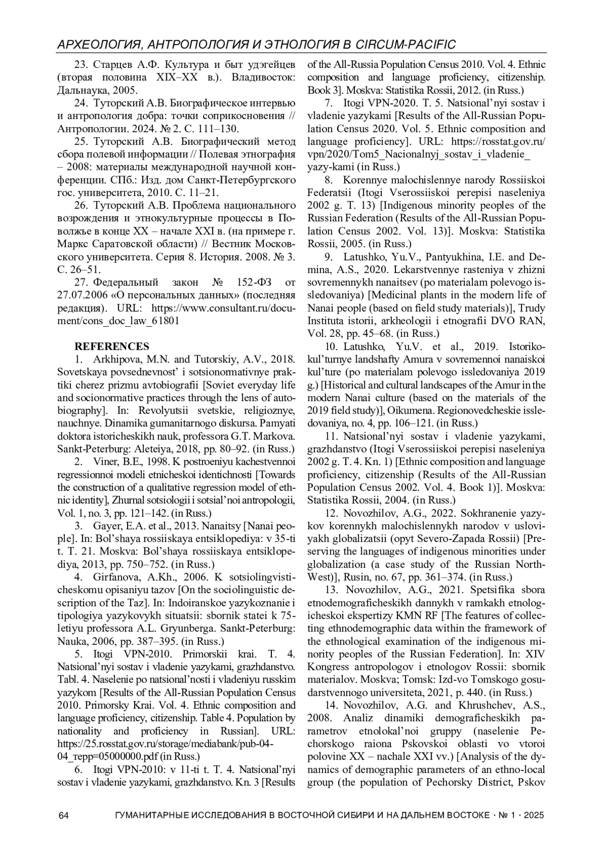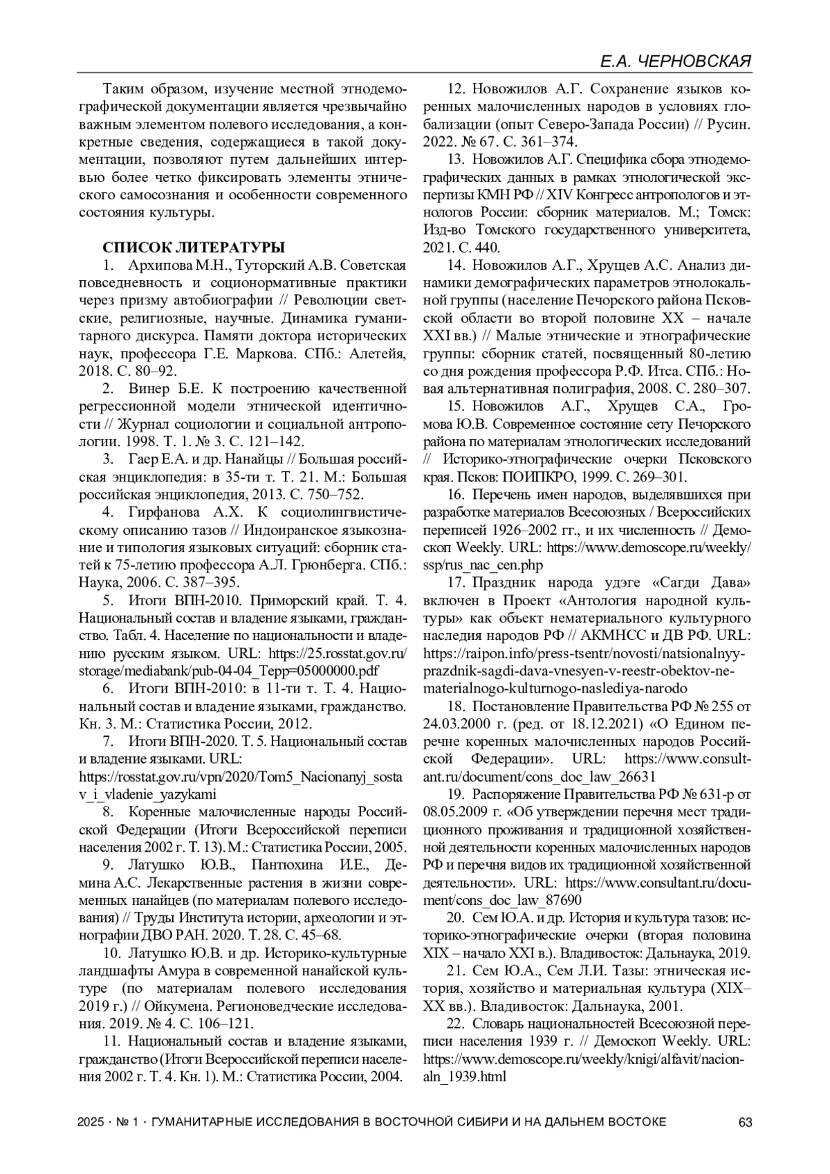 13. Новожилов А.Г. Специфика сбора этнодемографических данных в рамках этнологической экспертизы КМН РФ // XIV Конгресс антропологов и этнологов России: сборник материалов. М.; Томск: Изд-во Томского государственного университета, 2021. С. 440.