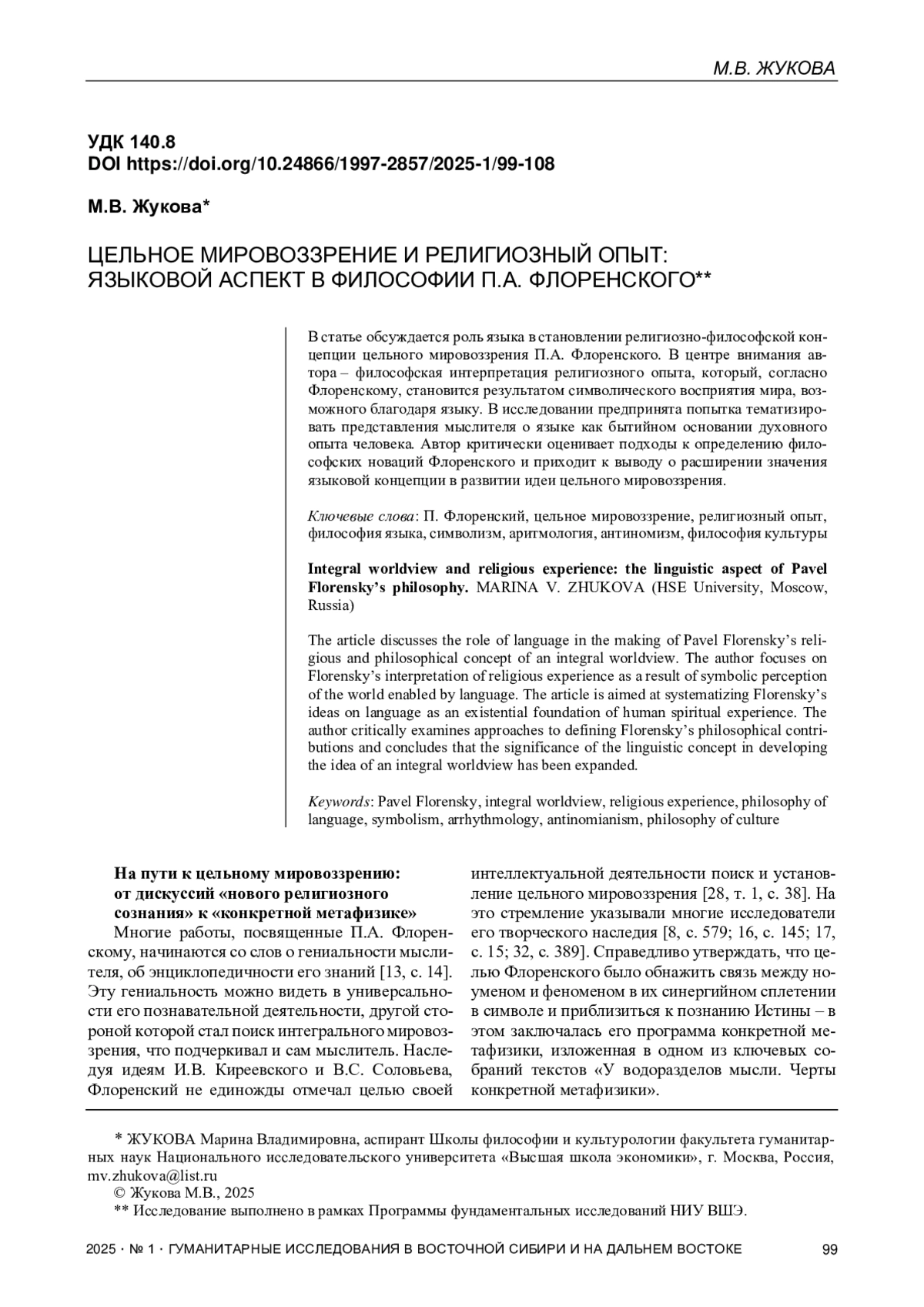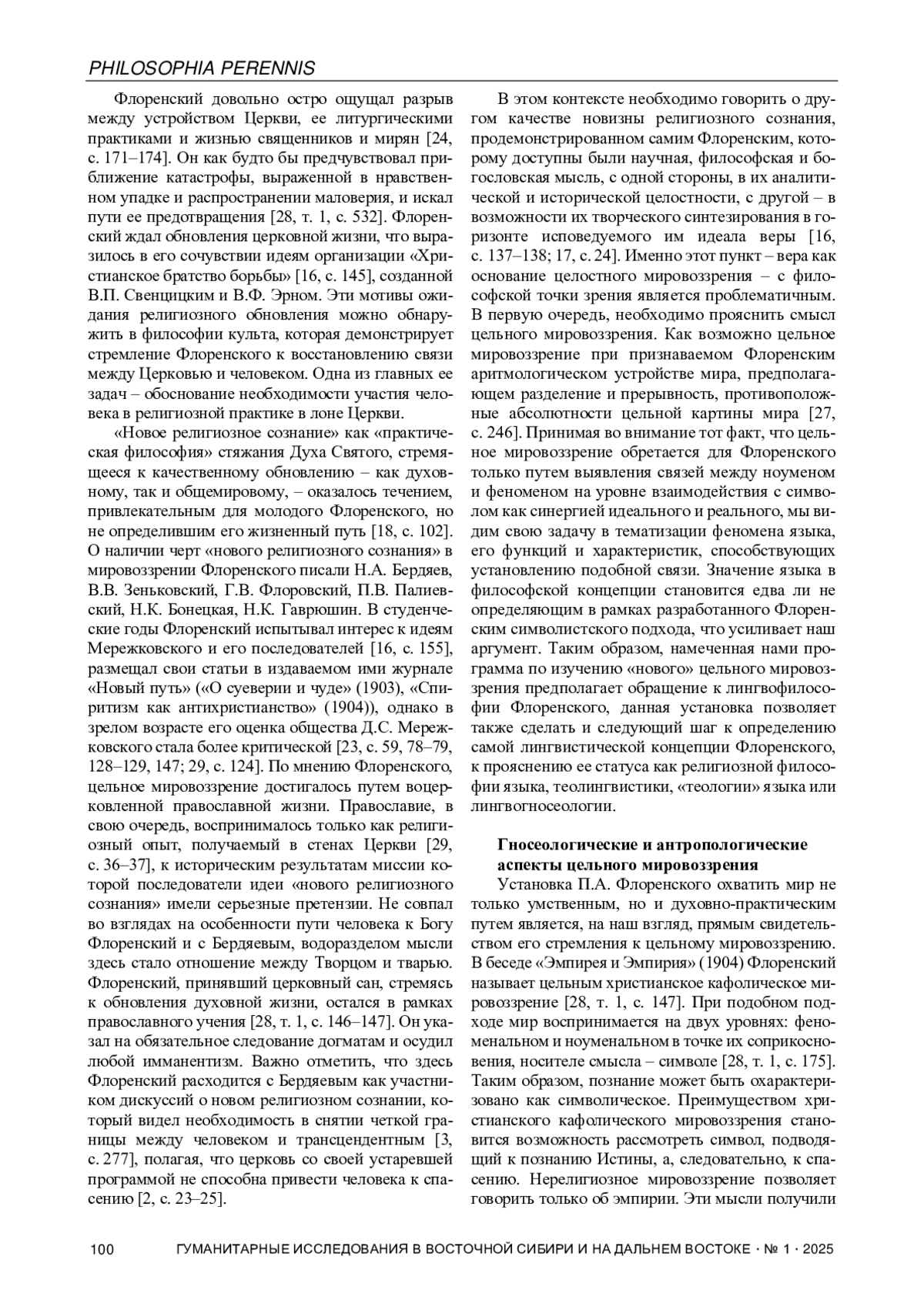 В статье обсуждается роль языка в становлении религиозно-философской концепции цельного мировоззрения П. А. Флоренского. В центре внимания автора – философская интерпретация религиозного опыта, который, согласно Флоренскому, становится результатом символического восприятия мира, возможного благодаря языку. В исследовании предпринята попытка тематизировать представления мыслителя о языке как бытийном основании духовного опыта человека. Автор критически оценивает подходы к определению философских новаций Флоренского и приходит к выводу о расширении значения языковой концепции в развитии идеи цельного мировоззрения.