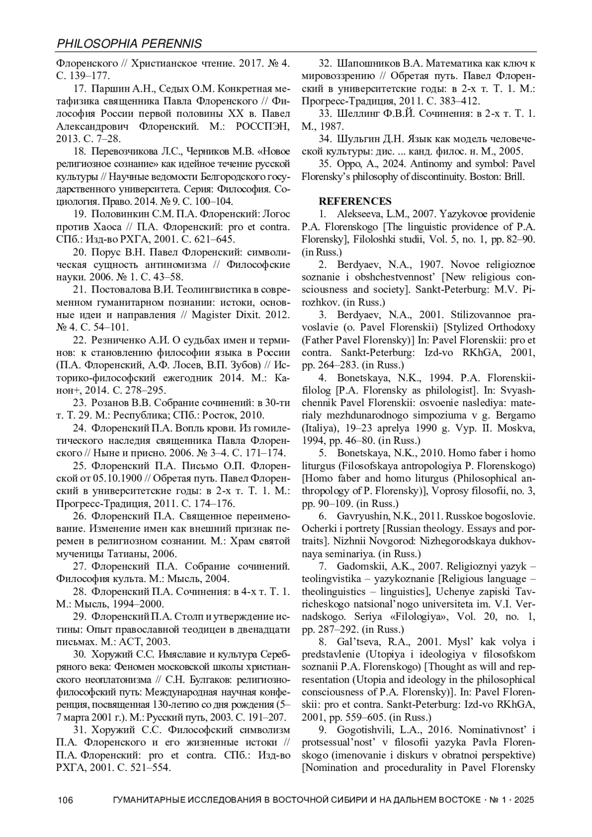 1. Алексеева Л.М. Языковое провидение П.А. Флоренского // Филолошки студии. 2007. Т. 5. № 1. С. 82-90.
