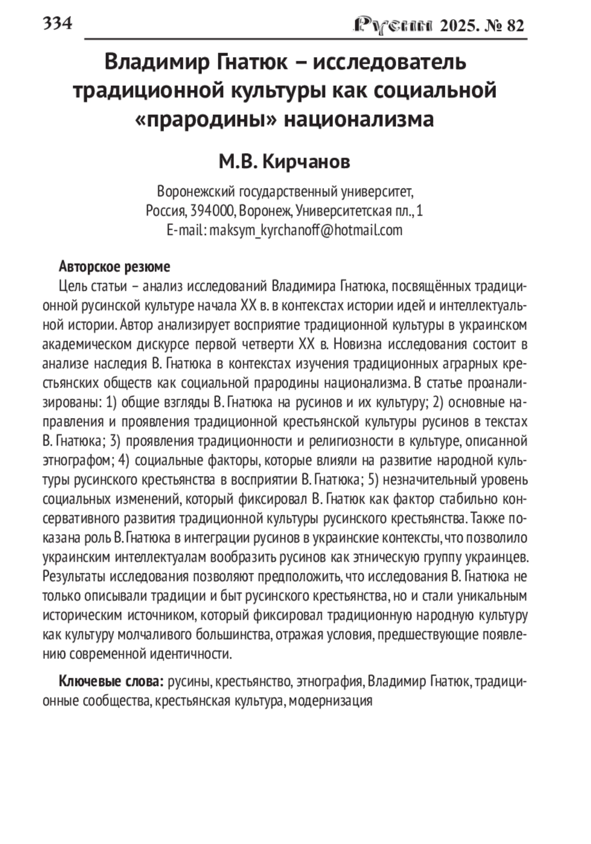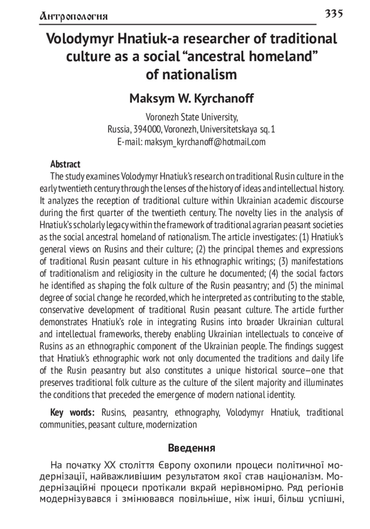 Цель статьи – анализ исследований Владимира Гнатюка, посвящённых традиционной русинской культуре начала ХХ в. в контекстах истории идей и интеллектуальной истории. Автор анализирует восприятие традиционной культуры в украинском академическом дискурсе первой четверти XX в. Новизна исследования состоит в анализе наследия В. Гнатюка в контекстах изучения традиционных аграрных крестьянских обществ как социальной прародины национализма. В статье проанализированы: 1) общие взгляды В. Гнатюка на русинов и их культуру; 2) основные направления и проявления традиционной крестьянской культуры русинов в текстах В. Гнатюка; 3) проявления традиционности и религиозности в культуре, описанной этнографом; 4) социальные факторы, которые влияли на развитие народной культуры русинского крестьянства в восприятии В. Гнатюка; 5) незначительный уровень социальных изменений, который фиксировал В. Гнатюк как фактор стабильно консервативного развития традиционной культуры русинского крестьянства. Также показана роль В. Гнатюка в интеграции русинов в украинские контексты, что позволило украинским интеллектуалам вообразить русинов как этническую группу украинцев. Результаты исследования позволяют предположить, что исследования В. Гнатюка не только описывали традиции и быт русинского крестьянства, но и стали уникальным историческим источником, который фиксировал традиционную народную культуру как культуру молчаливого большинства, отражая условия, предшествующие появлению современной идентичности.