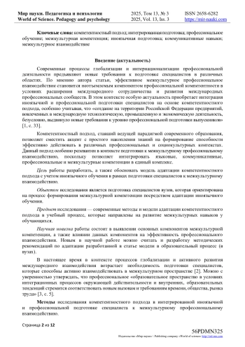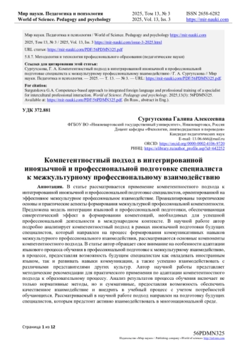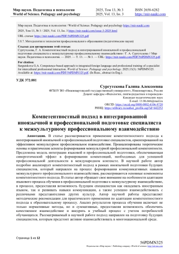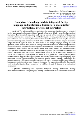 В статье рассматривается применение компетентностного подхода к интегрированной иноязычной и профессиональной подготовке специалистов, ориентированной на эффективное межкультурное профессиональное взаимодействие. Проанализированы теоретические основы и практические аспекты формирования межкультурной профессиональной компетентности. Предложена модель интеграции языковой и профессиональной подготовки, обеспечивающая синергетический эффект в формировании компетенций, необходимых для успешной профессиональной деятельности в международном контексте. В научной работе автор подробно анализирует компетентностный подход в рамках иноязычной подготовки будущих специалистов, который направлен на процесс формирования коммуникативных навыков межкультурного профессионального взаимодействия, рассматриваются основные компоненты компетентностного подхода. В статье автор обращает свое внимание на особенности адаптации языкового процесса обучения в профессиональной подготовке к межкультурному взаимодействию, в процессе, предоставляя возможность будущим специалистам как овладевать иностранным языком, так и развивать навыки коммуникации, а также успешно взаимодействовать с различными представителями других культур. Автор научной работы представляет методические рекомендации для практического применения по адаптации компетентностного подхода к образовательному процессу. Анализ результатов процесса обучения включает не только нормативные методы, но и суммативные, предоставляя возможность обеспечить качественное взаимодействие и внедрить в учебный процесс с учетом потребностей обучающихся. Рассматриваемый в научной работе подход направлен на подготовку будущих специалистов, которым предстоит активно взаимодействовать в многонациональной среде.
