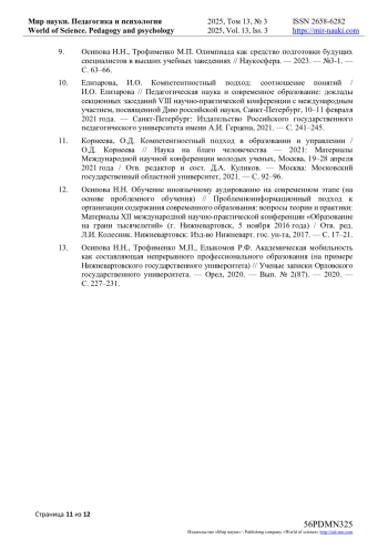 9. Осипова Н.Н., Трофименко М.П. Олимпиада как средство подготовки будущих специалистов в высших учебных заведениях // Наукосфера. - 2023. - №3-1. - С. 63-66. EDN: CSTOPL