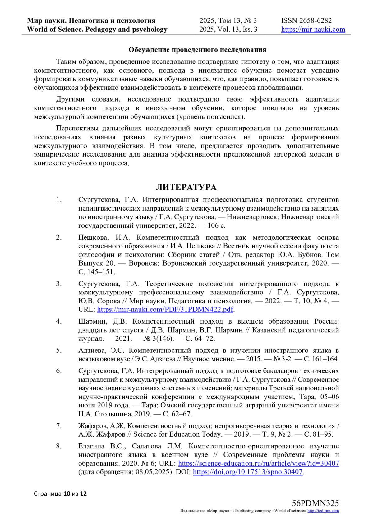 8. Елагина В.С., Салатова Л.М. Компетентностно-ориентированное изучение иностранного языка в военном вузе // Современные проблемы науки и образования. 2020. № 6; URL: https://science-education.ru/ru/article/view?id=30407 (дата обращения: 08.05.2025). DOI: 10.17513/spno.30407 EDN: QQDHOM