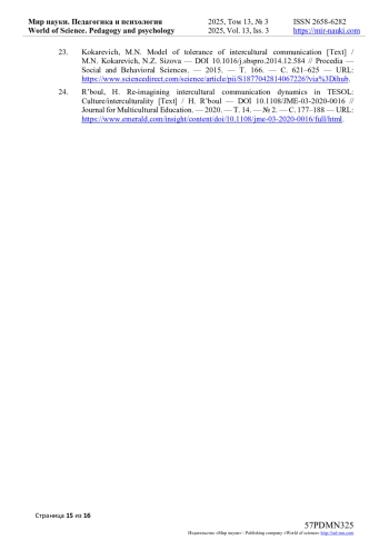 23. Kokarevich, M.N. Model of tolerance of intercultural communication [Text] / M.N. Kokarevich, N.Z. Sizova // Procedia - Social and Behavioral Sciences. - 2015. - T. 166. - C. 621-625 - URL: https://www.sciencedirect.com/science/article/pii/S1877042814067226?via%3Dihub. DOI: 10.1016/j.sbspro.2014.12.584