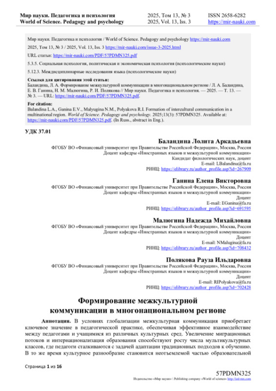 В условиях глобализации межкультурная коммуникация приобретает ключевое значение в педагогической практике, обеспечивая эффективное взаимодействие между педагогами и учащимися из различных культурных сред. Увеличение миграционных потоков и интернационализация образования способствуют росту числа мультикультурных классов, где педагоги сталкиваются с задачей адаптации традиционных подходов к обучению. В то же время культурное разнообразие становится неотъемлемой частью образовательной среды, требуя от педагогов умения учитывать различия для формирования инклюзивного пространства. Настоящая статья посвящена исследованию роли межкультурной коммуникации в развитии профессиональных компетенций педагогов, акцентируя её вклад в воспитание толерантности, взаимопонимания и успешной социализации учащихся в условиях современного общества. Исследование проведено на основе систематического анализа научной литературы. Были рассмотрены источники, посвященные педагогике, межкультурной коммуникации и их применению в образовательном процессе. Использовались методы контент-анализа и сравнительного анализа для выявления ключевых теоретических подходов и практических стратегий. Особое внимание уделялось работам, описывающим методы развития межкультурной компетентности педагогов, включая использование цифровых технологий, интерактивных инструментов и виртуальных платформ. Результаты показали, что межкультурная коммуникация базируется на культурной сенситивности, толерантности и адаптивности педагогов. Эффективными стратегиями развития этих качеств признаны мультимедийные технологии, интерактивные методы (например, кейс-стади) и онлайн-платформы для общения. Установлено, что учет культурных особенностей учащихся повышает эффективность обучения и способствует созданию инклюзивной среды, где каждый чувствует себя вовлеченным. Эти подходы помогают педагогам лучше понимать культурные различия, что улучшает качество образовательного процесса. Полученные выводы подчеркивают важность интеграции межкультурной коммуникации в программы подготовки педагогов.