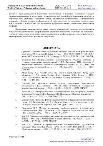 1. Oyserman D. Possible selves and academic outcomes: How and when possible selves impel action / D. Oyserman, D. Bybee, K. Terry - // Journal of Personality and Social Psychology. - 2006. - Т. 91, № 1. - С. 188-204. DOI: 10.1037/0022-3514.91.1.188