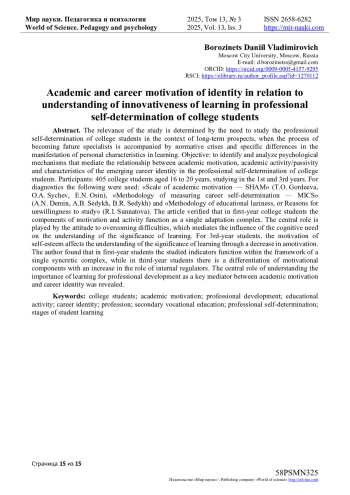 Цель: выявление и анализ психологических механизмов, опосредующих взаимосвязь между академической мотивацией, учебной активностью/пассивностью и характеристиками формирующейся карьерной идентичности в профессиональном самоопределении студентов колледжей. Участники: 405 студентов колледжей в возрасте от 16 до 20 лет, обучающихся на 1-ых и 3-их курсах. Для диагностики использовались: «Шкалы академической мотивации - ШАМ» (Т. О. Гордеева, О. А. Сычев, Е. Н. Осин), «Методика измерения карьерного самоопределения - МИКС» (А. Н. Дёмин, А. Б. Седых, Б. Р. Седых) и «Методика учебная лень, или Причины нежелания учиться» (Р. И. Суннатова). В статье проверено, что у первокурсников колледжей компоненты мотивации и активности функционируют как единый комплекс адаптации. Центральную роль играет отношение к преодолению трудностей, которое опосредует влияние познавательной потребности на понимание значимости обучения. Для 3-их курсов мотивация самоуважения влияет на понимание значимости обучения через снижение мотивации. Автором установлено, что у первокурсников исследуемые показатели функционируют в рамках единого синкретического комплекса, тогда как у третьекурсников происходит дифференциация мотивационных компонентов с усилением роли внутренних регуляторов. Выявлена центральная роль понимания значимости обучения для профессионального становления как ключевого медиатора между академической мотивацией и карьерной идентичностью.