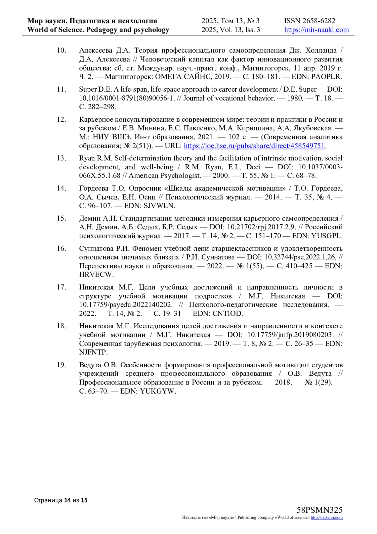 15. Демин А.Н. Стандартизация методики измерения карьерного самоопределения / А.Н. Демин, А.Б. Седых, Б.Р. Седых - // Российский психологический журнал. - 2017. - Т. 14, № 2. - С. 151-170 -. DOI: 10.21702/rpj.2017.2.9 EDN: YUSGPL
