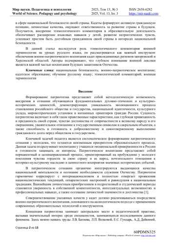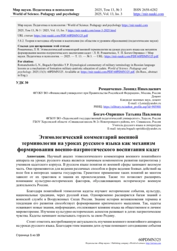 В данной статье исследуется роль этимологического комментария военной терминологии на уроках русского языка, он рассматривается как важный инструмент обеспечения военно-патриотического воспитания кадет присоединенных регионов запорожской и Херсонской областей. Авторы подчеркивают, что глубокое понимание военной лексики является важной частью воспитания будущих защитников Отечества.
