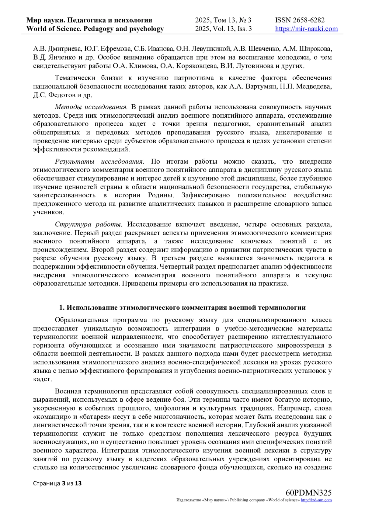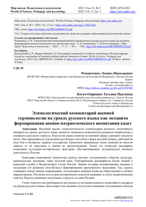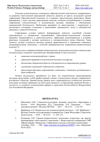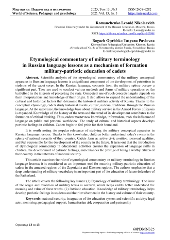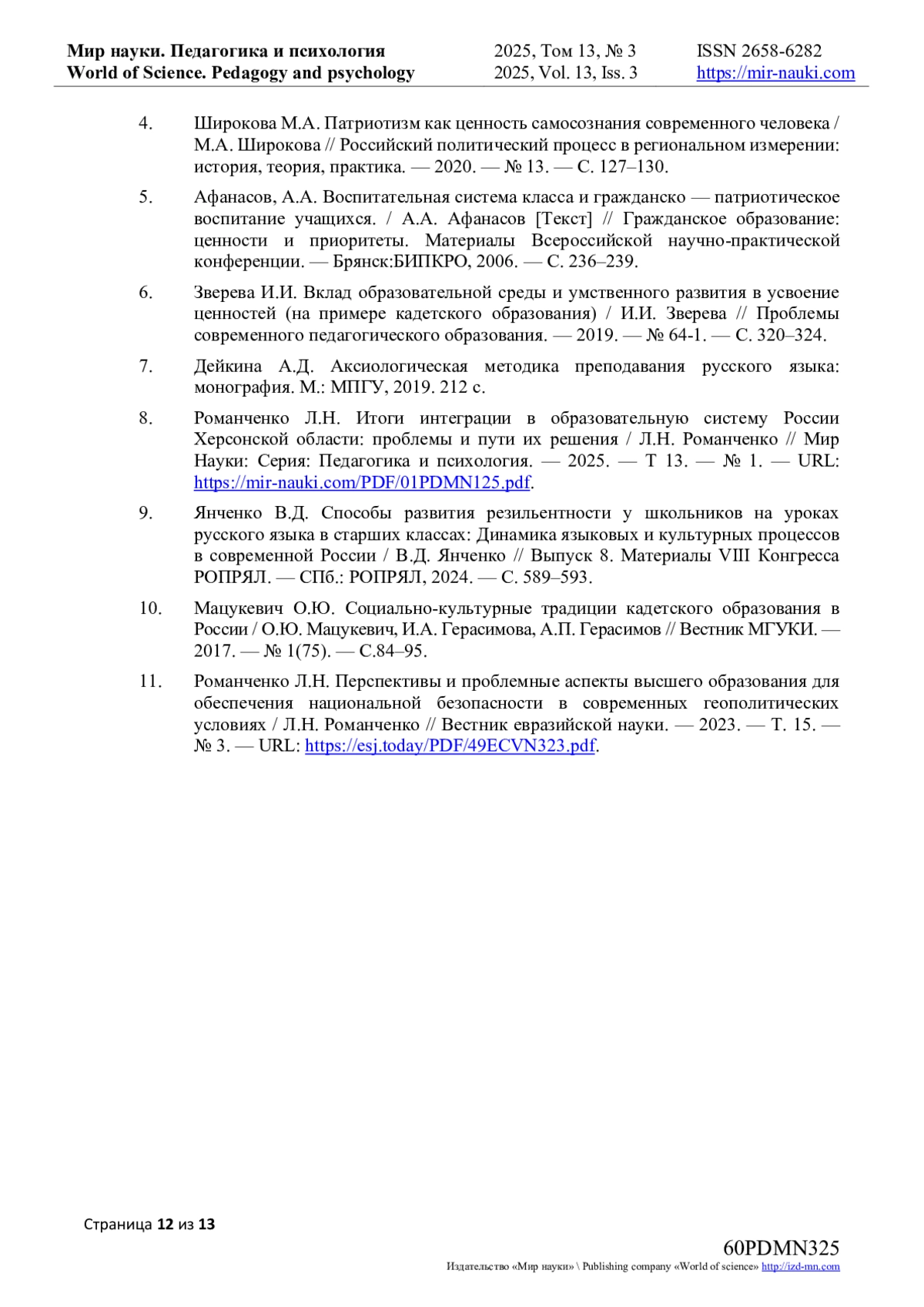 8. Романченко Л.Н. Итоги интеграции в образовательную систему России Херсонской области: проблемы и пути их решения / Л.Н. Романченко // Мир Науки: Серия: Педагогика и психология. - 2025. - Т 13. - № 1. - URL: https://mir-nauki.com/PDF/01PDMN125.pdf. EDN: EWRVIY