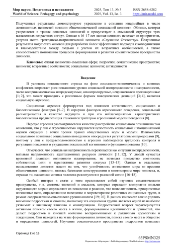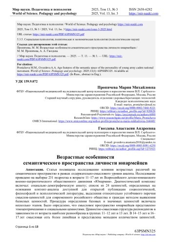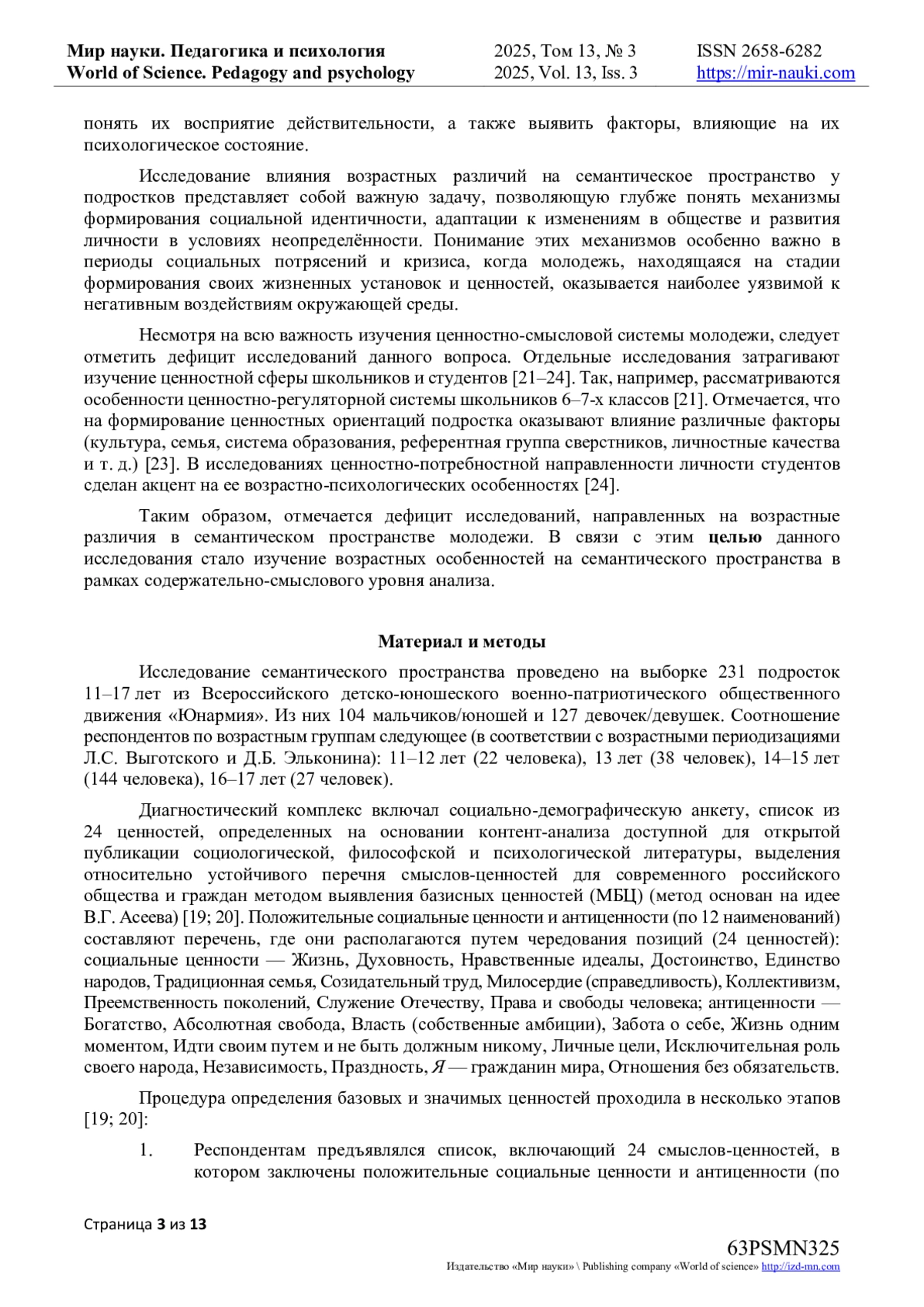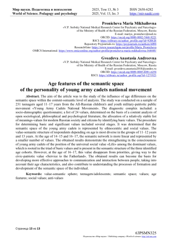 Статья посвящена исследованию влияния возрастных различий на семантическое пространство в рамках содержательно-смыслового уровня анализа. Исследование проведено на выборке 231 подростка в возрасте 11-17 лет из Всероссийского детско-юношеского военно-патриотического общественного движения «Юнармия». Диагностический комплекс включал: социально-демографическую анкету; список из 24 ценностей, определенных на основании контент-анализа доступной для открытой публикации социологической, философской и психологической литературы, выделения относительно устойчивого перечня смыслов-ценностей для современного российского общества и граждан методом выявления базисных ценностей. Процедура определения базовых и значимых ценностей включала несколько этапов. Было определено, что смысловое пространство юнармейцев представлено этноцентрическими и социальными ценностями. Ценностно-смысловая структура респондентов в зависимости от возраста наиболее разнообразна в группах 11-12 лет и 13 лет. В 14-15 лет и 16-17 лет смысловая сеть более линейная и представлена меньшим количеством ценностей. Полученные результаты демонстрируют укрепление в сознании юнармейцев в числе доминантных ценностей позиции общечеловеческой социальной ценности «Жизнь», которая укореняется в триаде основных ценностей и присутствует в смысловой структуре трех выделенных возрастных когорт. Однако в 16-17 лет данная ценность исчезает из приоритетов, уступая место гражданско-патриотической ценности «Служение Отечеству». Полученные результаты могут стать основой для разработки более эффективных подходов к коммуникации и взаимодействию между людьми с учетом их возрастных особенностей, а также способствовать пониманию процессов формирования и развития семантического пространства личности.