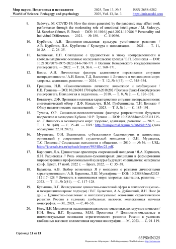 16. Муравьева, О.И. Взаимосвязь субъективного благополучия и ценностных ориентаций у современной студенческой молодежи / О.И. Муравьева, Т.С. Попкова // Социальная психология и общество. - 2010. - № 36. - URL: https://journals.tsu.ru/uploads/import/985/files/21.pdf.