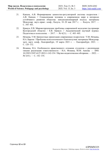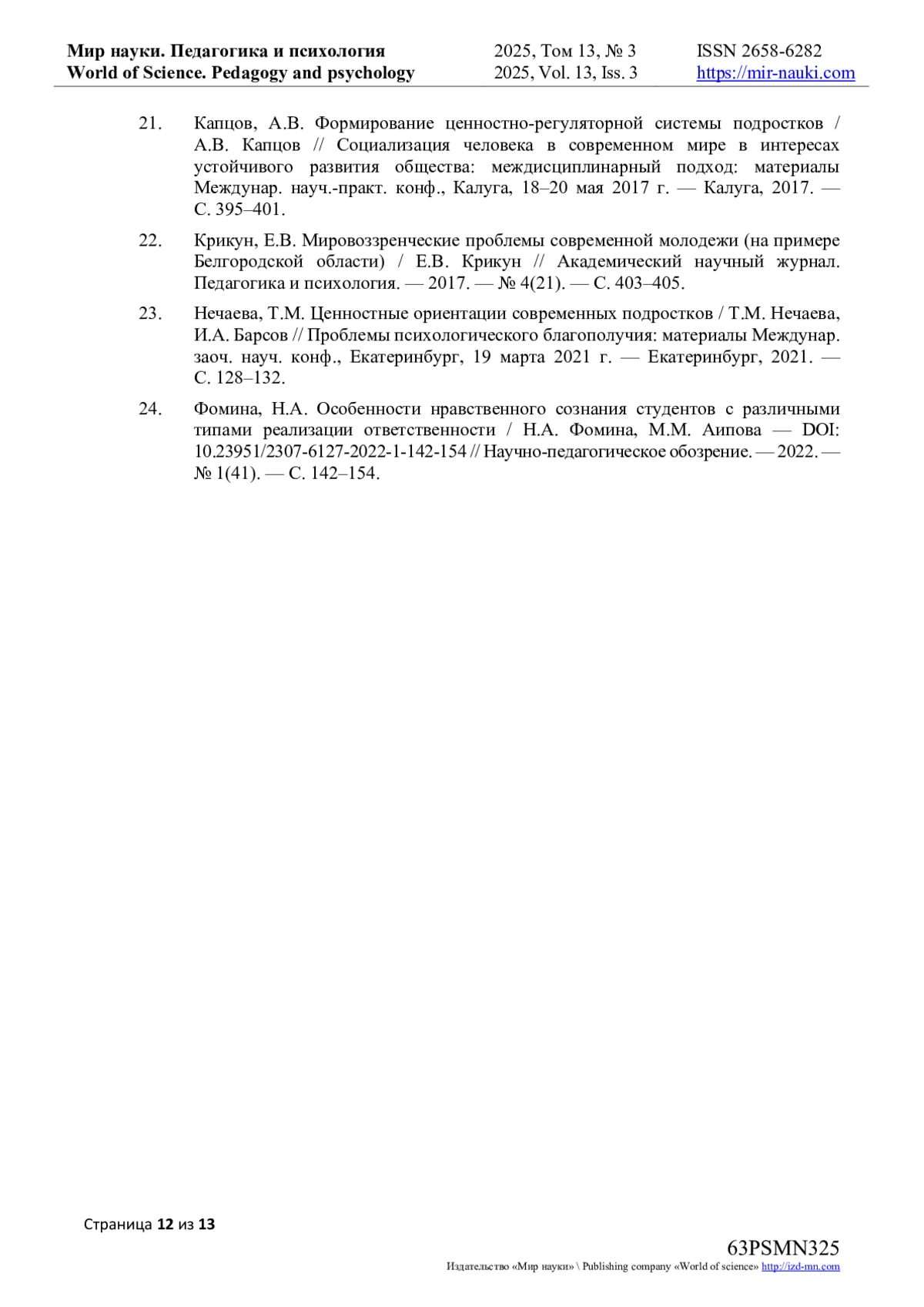 24. Фомина, Н.А. Особенности нравственного сознания студентов с различными типами реализации ответственности / Н.А. Фомина, М.М. Аипова - // Научно-педагогическое обозрение. - 2022. - № 1(41). - С. 142-154. DOI: 10.23951/2307-6127-2022-1-142-154 EDN: FLJTRK