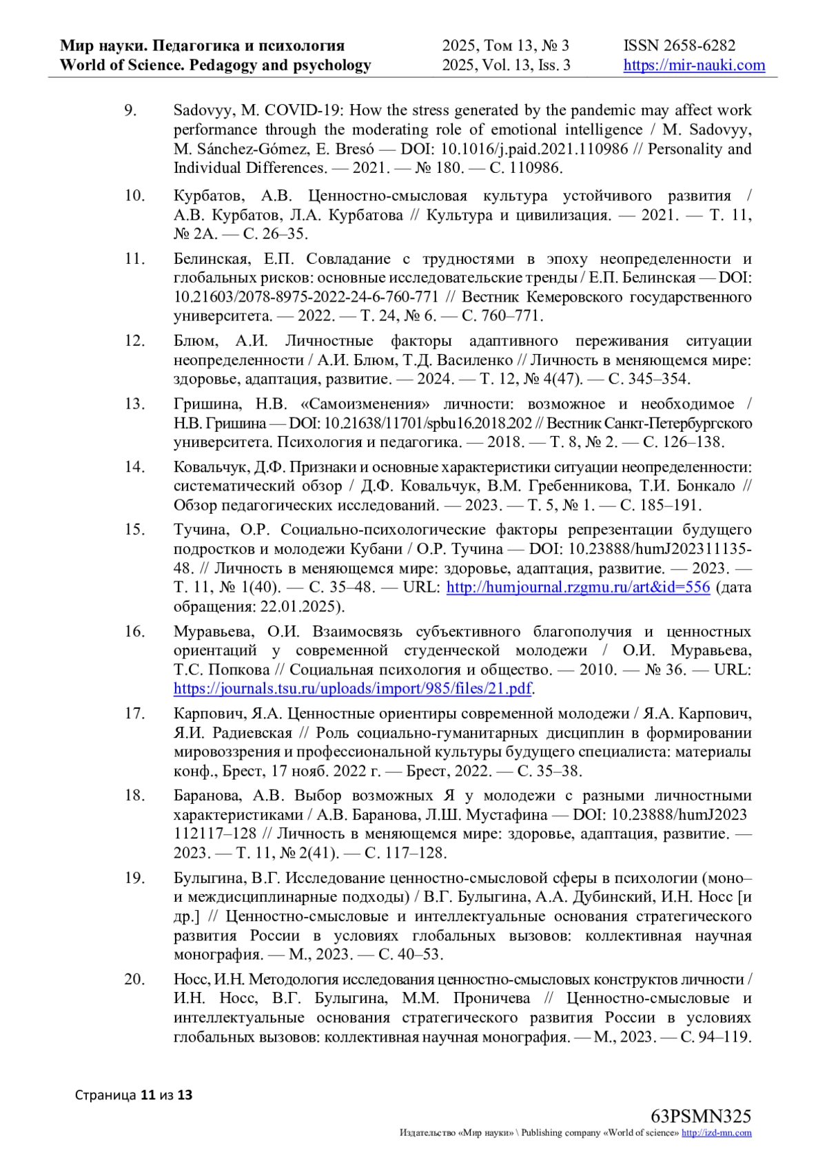 11. Белинская, Е.П. Совладание с трудностями в эпоху неопределенности и глобальных рисков: основные исследовательские тренды / Е.П. Белинская - // Вестник Кемеровского государственного университета. - 2022. - Т. 24, № 6. - С. 760-771. DOI: 10.21603/2078-8975-2022-24-6-760-771 EDN: CRJBCV