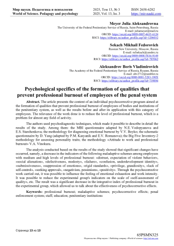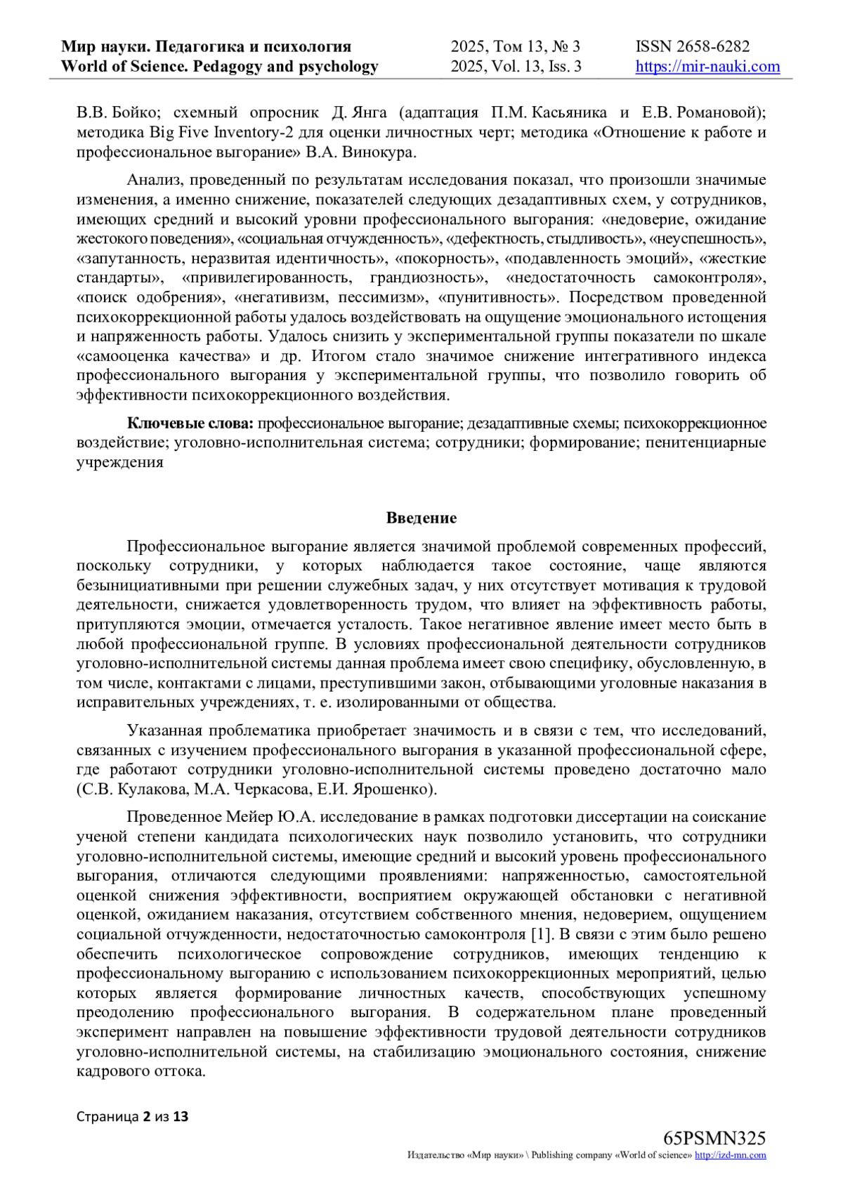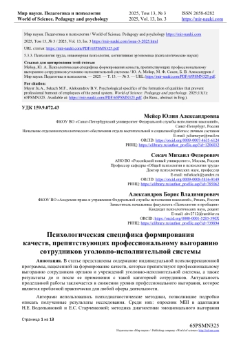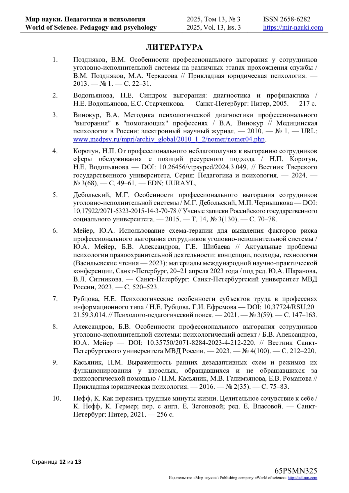 8. Александров, Б.В. Особенности профессионального выгорания сотрудников уголовно-исполнительной системы: психологический аспект / Б.В. Александров, Ю.А. Мейер - // Вестник Санкт-Петербургского университета МВД России. - 2023. - № 4(100). - С. 212-220. DOI: 10.35750/2071-8284-2023-4-212-220 EDN: PALAVD