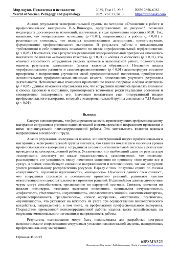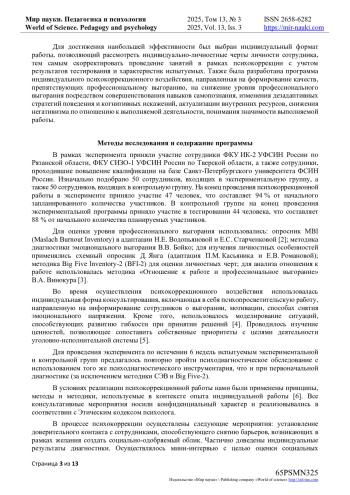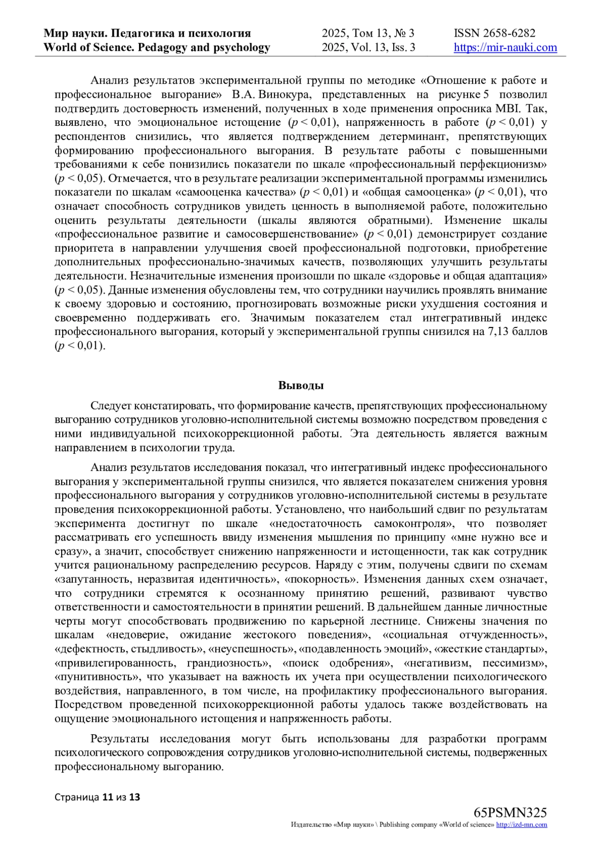 В статье представлены содержание индивидуальной психокоррекционной программы, нацеленной на формирование качеств, которые препятствуют профессиональному выгоранию сотрудников органов и учреждений уголовно-исполнительной системы, а также результаты до и после ее применения с такой категорией сотрудников. Актуальность проделанной работы заключается в снижении уровня профессионального выгорания, которое является проблемой практически для любой сферы деятельности.