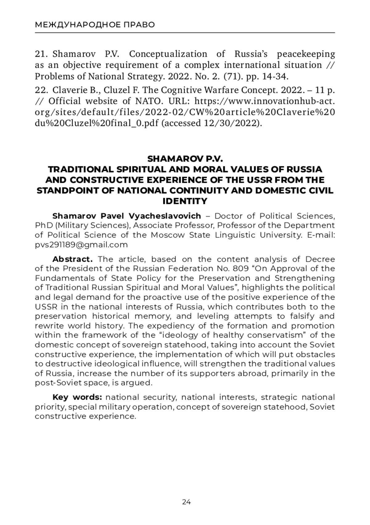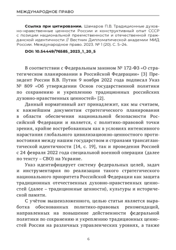 В статье на основе контент-анализа Указа Президента Российской Федерации № 809 «Об утверждении Основ государственной политики по сохранению и укреплению традиционных российских духовно-нравственных ценностей» вычленяется политико-правовая востребованность проактивного использования в национальных интересах России положительного опыта СССР, способствующего как сохранению исторической памяти, так и нивелирующего попытки фальсификации и переписывания мировой истории. Аргументируется целесообразность становления и продвижения в рамках «идеологии здорового консерватизма» отечественной концепции суверенной государственности, учитывающей советский конструктивный опыт, реализация которого поставит препон деструктивному идеологическому воздействию, будет способствовать укреплению традиционных ценностей России, наращиванию числа её сторонников за рубежом, в первую очередь – на постсоветском пространстве.