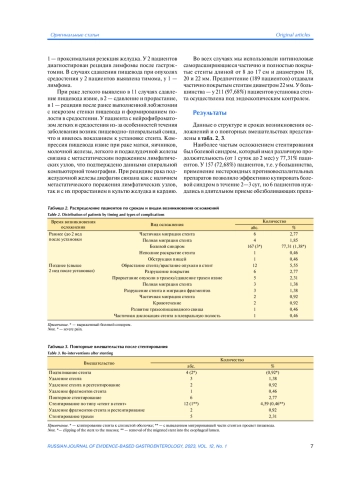 Заключение. При выполнении операций на сквозном транспеченочном дренаже по Гетцу послеоперационная летальность составляет 5,2%, а при стриктурах — 3,4%. В отдаленные сроки после гепатикоэнтеростомии на сменном дренаже по Гетцу анастомотические стриктуры развиваются у 1,37% пациентов, а после бескаркасной гепатикоэнтеростомии и гепатикодуоденостомии — у 6,67%.