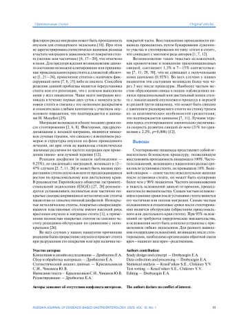 Выводы. Установка стентов у пациентов с дисфагией злокачественного генеза является методом выбора. Стентирование под рентгенологическим контролем может быть применено на этапах освоения метода и при «высокой» локализации проксимального края стеноза. В остальных случаях достаточно эндоскопического контроля. Необходима организация обратной связи врач-пациент или врач-родственник для своевременного выявления и коррекции осложнений. Более 95% осложнений после стентирования могут быть устранены с использованием эндоскопических методов.