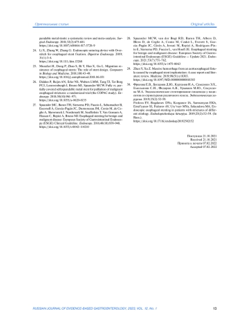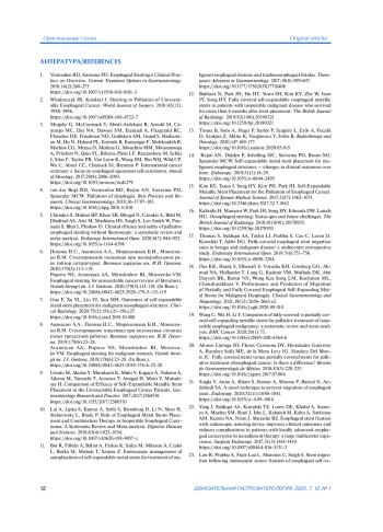 6. Попова Н.С., Аванесян А.А., Мирошников Б.И., Моисеенко В.М. Стентирование пищевода при неоперабельном раке (обзор литературы). Вестник хирургии им. И.И. Грекова. 2020;179(5):113-119.