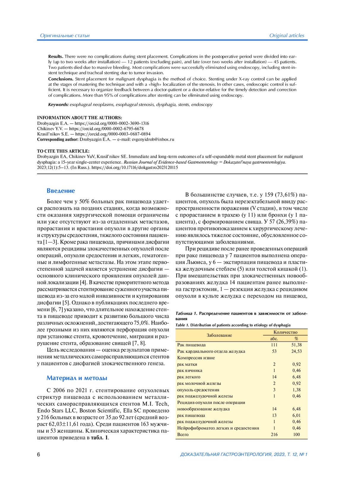 Материал и методы. За период 2006—2021 гг. установка металлических саморасправляющихся стентов при злокачественной дисфагии проведена 216 пациентам (средний возраст 62,03±11,61 года; 163 мужчины и 53 женщины). У 111 пациентов был рак пищевода, у 53 — рак кардиального отдела желудка с переходом на пищевод, у 23 — компрессия из-за сдавления извне при других опухолях, у 28 — рецидив рака после операций на пищеводе и желудке, у 1 — нейрофиброматоз легких и средостения.