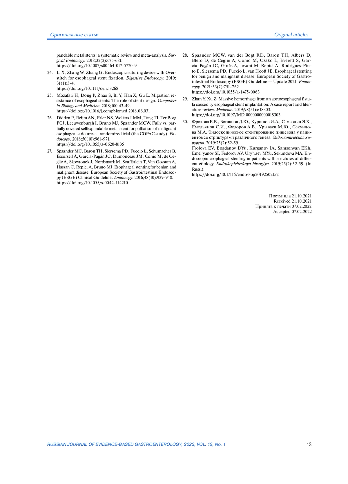 30. Фролова Е.В., Богданов Д.Ю., Курганов И.А., Самсонян Э.Х., Емельянов С.И., Федоров А.В., Урываев М.Ю., Секундова М.А. Эндоскопическое стентирование пищевода у пациентов со стриктурами различного генеза. Эндоскопическая хирургия. 2019;25(2):52-59.
