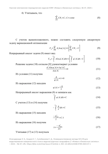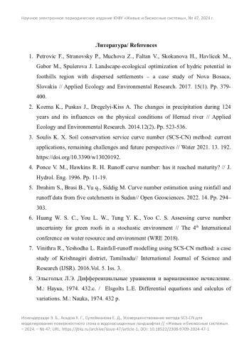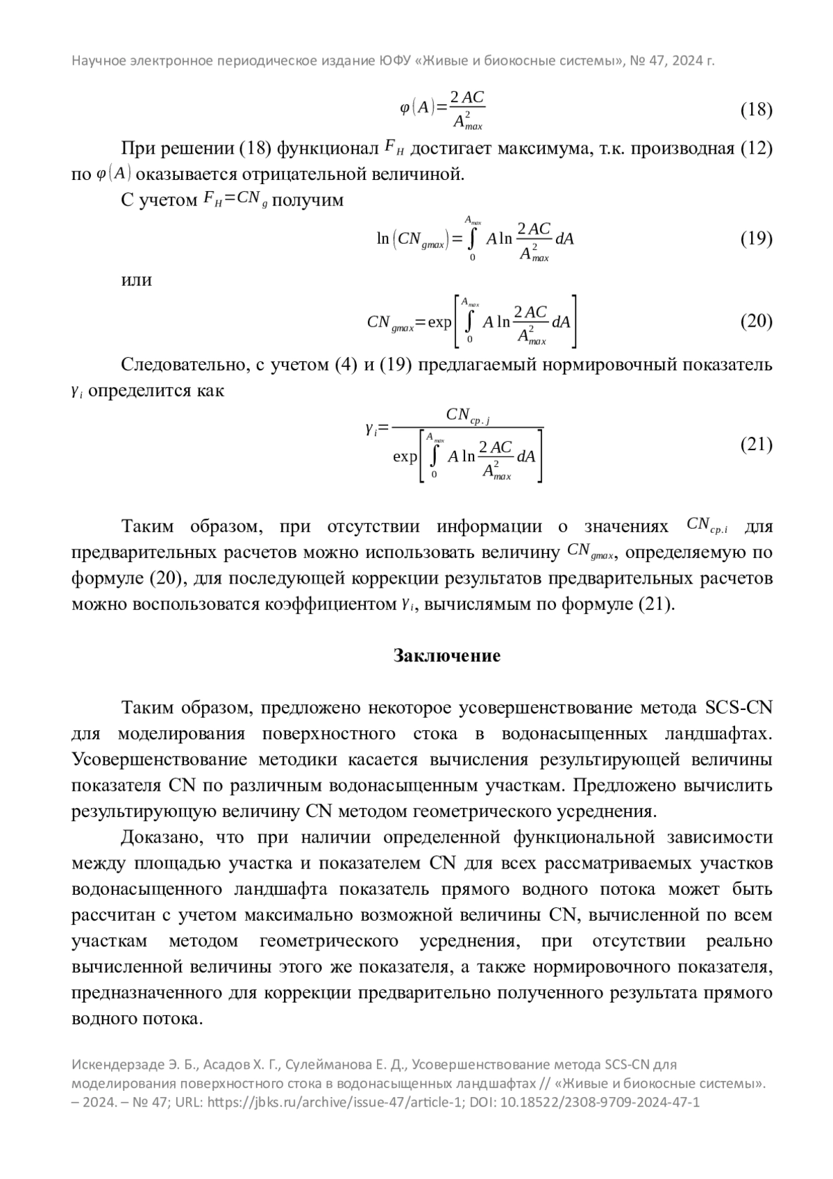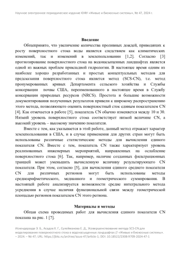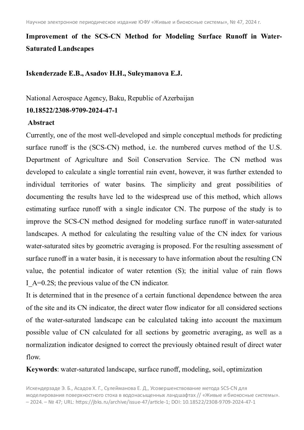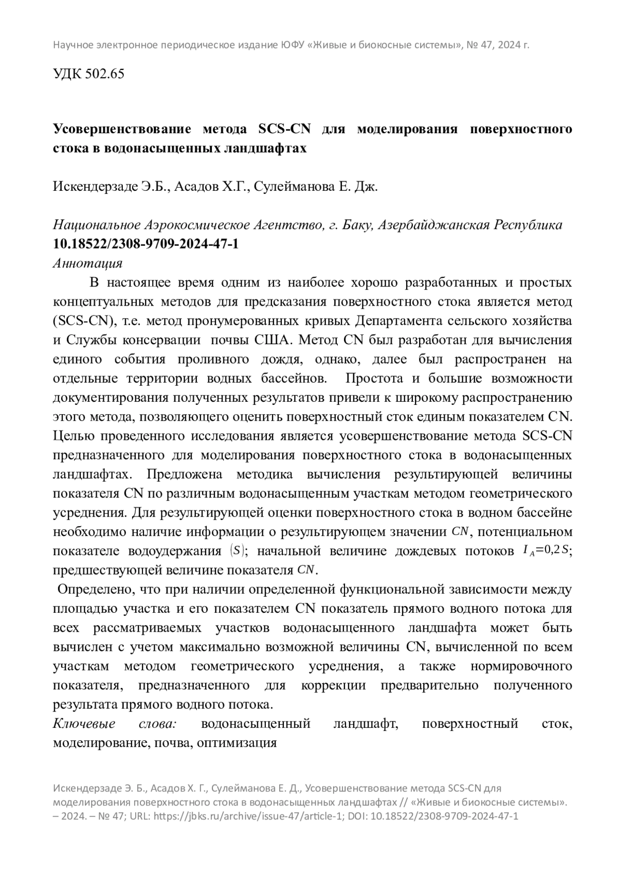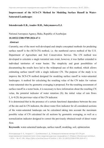 В настоящее время одним из наиболее хорошо разработанных и простых концептуальных методов для предсказания поверхностного стока является метод (SCS-CN), т. е. метод пронумерованных кривых Департамента сельского хозяйства и Службы консервации почвы США. Метод СN был разработан для вычисления единого события проливного дождя, однако, далее был распространен на отдельные территории водных бассейнов. Простота и большие возможности документирования полученных результатов привели к широкому распространению этого метода, позволяющего оценить поверхностный сток единым показателем СN. Целью проведенного исследования является усовершенствование метода SCS-CN предназначенного для моделирования поверхностного стока в водонасыщенных ландшафтах. Предложена методика вычисления результирующей величины показателя CN по различным водонасыщенным участкам методом геометрического усреднения. Для результирующей оценки поверхностного стока в водном бассейне необходимо наличие информации о результирующем значении CN, потенциальном показателе водоудержания (S ); начальной величине дождевых потоков I A=0,2 S; предшествующей величине показателя CN.