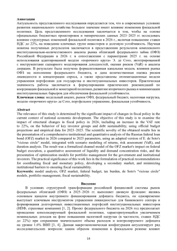 Актуальность представленного исследования определяется тем, что в современных условиях развития национального хозяйства большое значение имеет влияние изменения фискальной политики. Цель представленного исследования заключается в том, чтобы на основе официальных бюджетных проектировок и эмпирических данных 2023–2025 гг. исследовать влияние структурных изменений фискальной политики в 2026 г., включая повышение ставки НДС до 22%, на поведение ключевых групп инвесторов и долговую устойчивость. Научная новизна полученных результатов заключается в представлении результатов комплексного институционально-количественного анализа рынка облигаций федерального займа (ОФЗ) Российской Федерации в 2026 г. в сопоставлении с параметрами 2025 г. на основе использования адаптированной модели «порочного круга» Э. де Сото, интегрированной с инструментами сценарного моделирования доходностей, оценки рисков (VaR) и анализа дюрации. В результате была получена формализованная канальная модель влияния рынка ОФЗ на исполнение федерального бюджета, и дана количественная оценка рисков ликвидности и концентрации спроса, а также представлены оптимизационные модели управления портфелями для государства и институциональных инвесторов. Практическая значимость работы заключается в формулировании практических рекомендаций по координации фискальной и монетарной политики, развитию вторичного рынка и минимизации институциональных барьеров для обеспечения фискальной устойчивости.