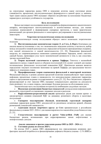 В условиях структурной трансформации российской финансовой системы рынок федеральных облигаций (ОФЗ) в 2025–2026 гг. выполняет двоякую функцию: являясь основным каналом внутреннего финансирования дефицита бюджета, он одновременно выступает ключевым инструментом управления ликвидностью для банковского сектора и формирования долгосрочных инвестиционных портфелей институциональных инвесторов (НПФ, страховые компании) [1, 2]. Проект федерального бюджета на 2026 год предполагает проведение консолидирующей фискальной политики, характеризующейся увеличением номинальных доходов на фоне повышения налоговой нагрузки (в частности, ставки НДС до 22%) при сохранении значительного объема расходов и контролируемого дефицита на уровне 1.6% ВВП [3, 4]. Данная макроэкономическая конфигурация актуализирует ряд исследовательских вопросов: каким образом изменения в фискальном режиме влияют на структурные параметры рынка ОФЗ и поведение агентов; какие системные риски (ликвидности, процентные, институциональные) формируются в данной среде; и, наконец, через какие каналы рынок ОФЗ оказывает обратное воздействие на исполнение бюджетных параметров и долговую устойчивость государства.