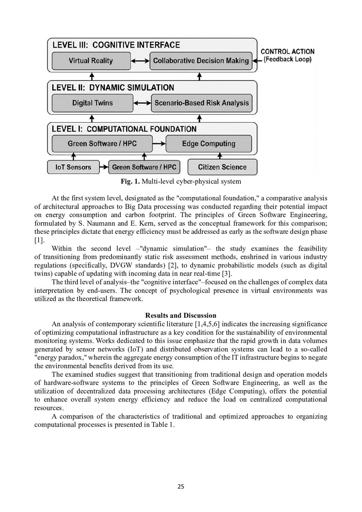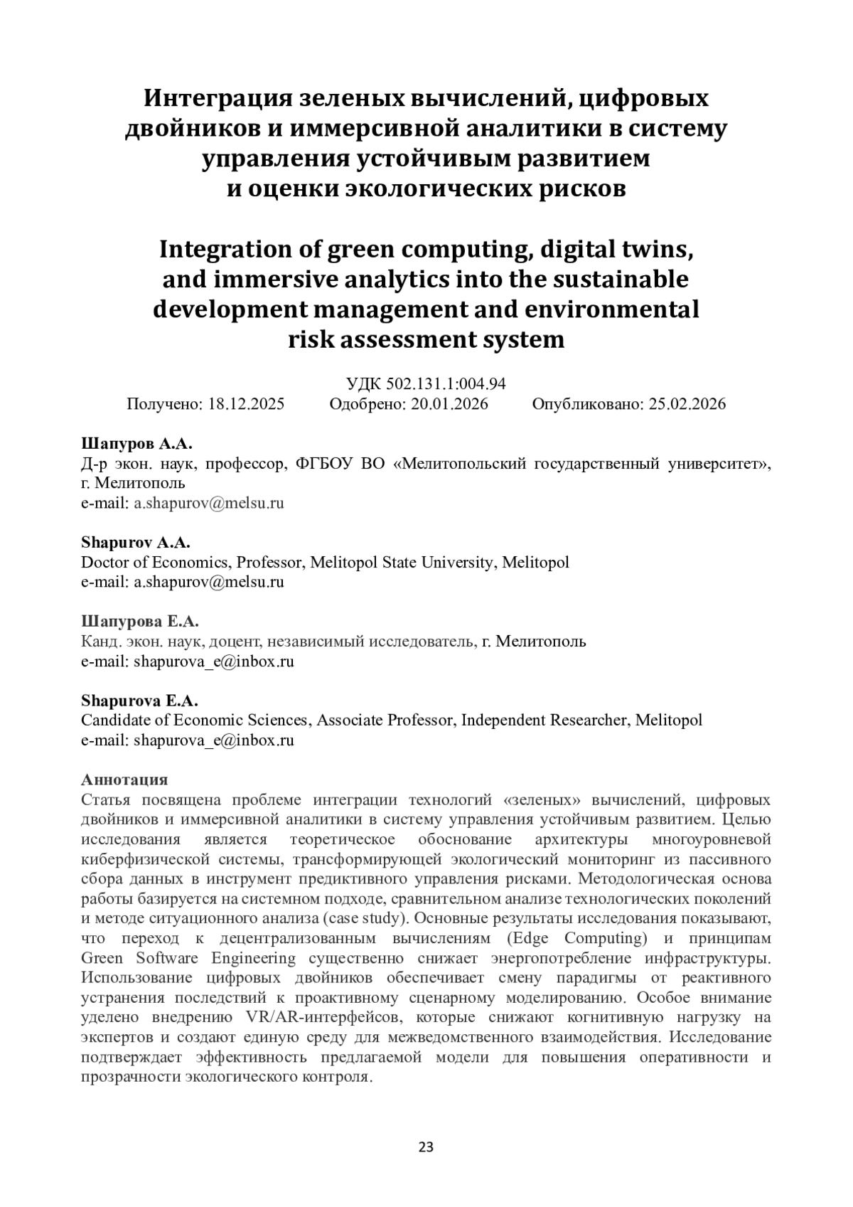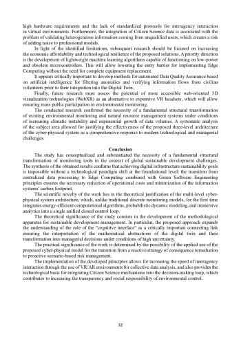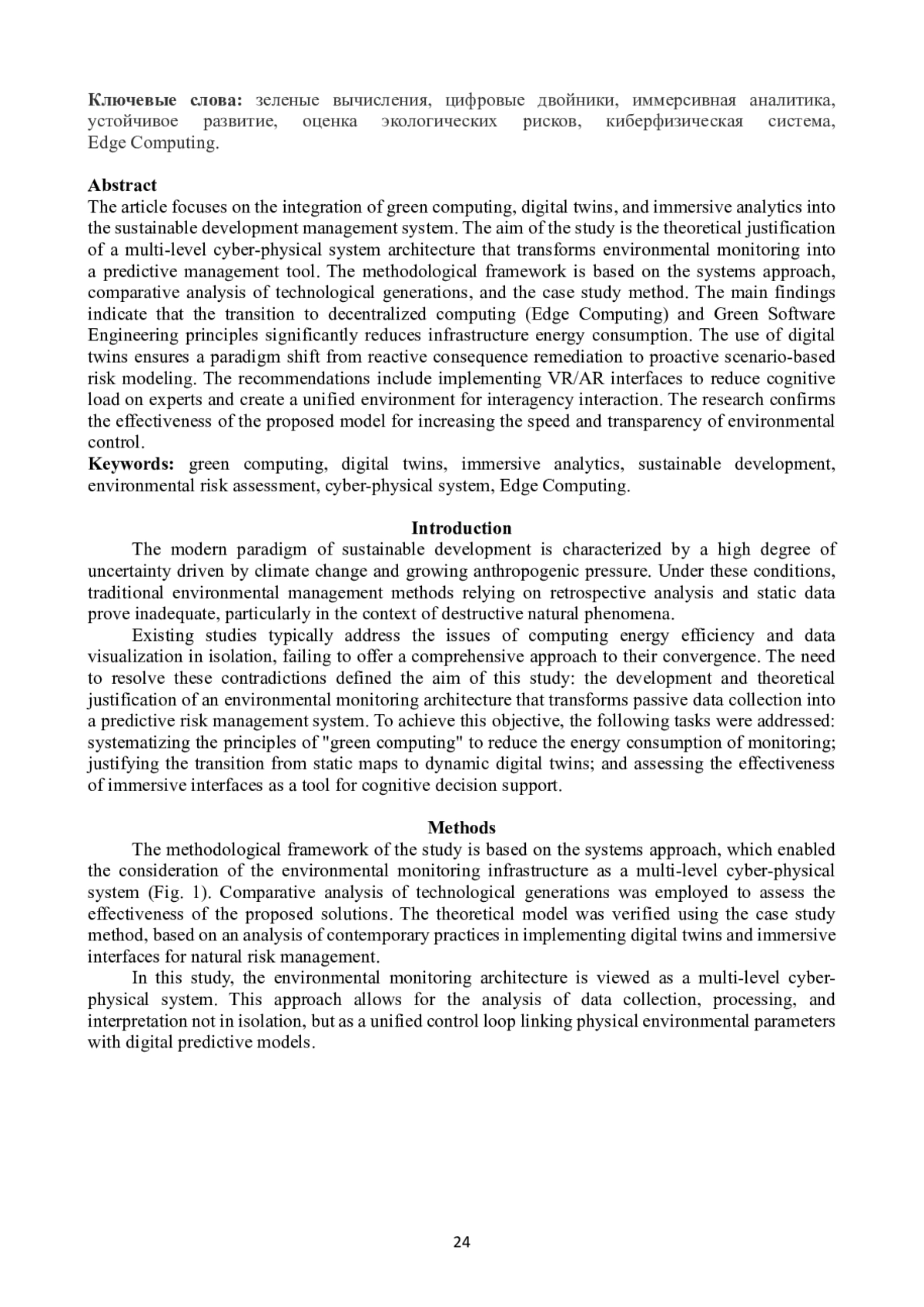 Статья посвящена проблеме интеграции технологий «зеленых» вычислений, цифровых двойников и иммерсивной аналитики в систему управления устойчивым развитием. Целью исследования является теоретическое обоснование архитектуры многоуровневой киберфизической системы, трансформирующей экологический мониторинг из пассивного сбора данных в инструмент предиктивного управления рисками. Методологическая основа работы базируется на системном подходе, сравнительном анализе технологических поколений и методе ситуационного анализа (case study). Основные результаты исследования показывают, что переход к децентрализованным вычислениям (Edge Computing) и принципам Green Software Engineering существенно снижает энергопотребление инфраструктуры. Использование цифровых двойников обеспечивает смену парадигмы от реактивного устранения последствий к проактивному сценарному моделированию. Особое внимание уделено внедрению VR/AR-интерфейсов, которые снижают когнитивную нагрузку на экспертов и создают единую среду для межведомственного взаимодействия. Исследование подтверждает эффективность предлагаемой модели для повышения оперативности и прозрачности экологического контроля.