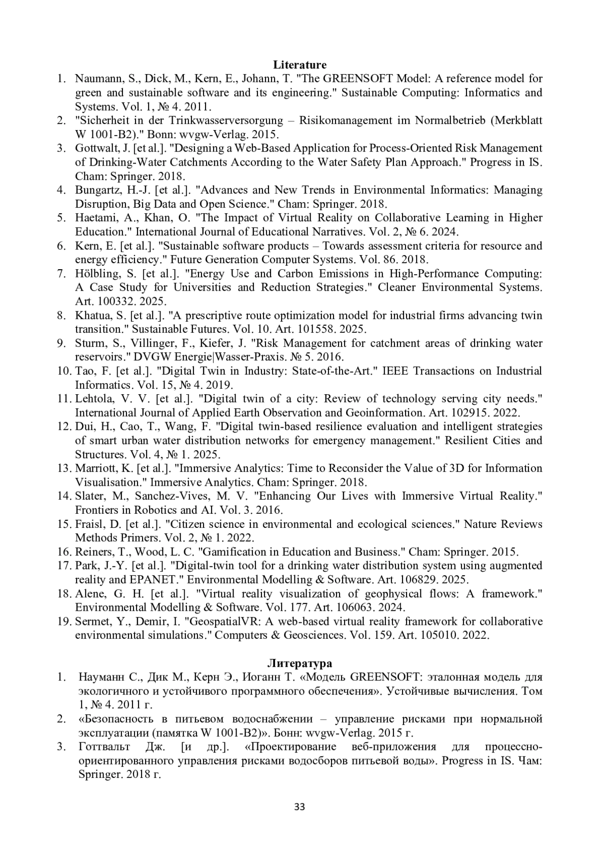 17. Пак Дж.-И. [и др.]. “Инструмент цифрового двойника для системы распределения питьевой воды с использованием дополненной реальности и EPANET”. Моделирование и ПО для окружающей среды. 2025 г.