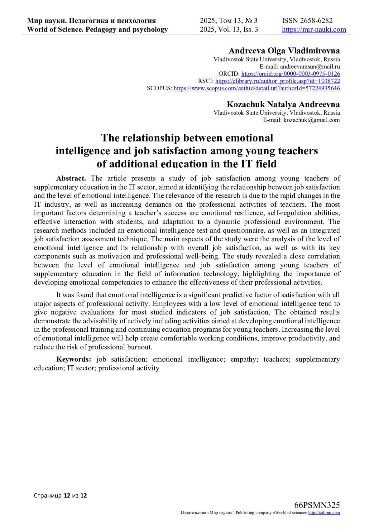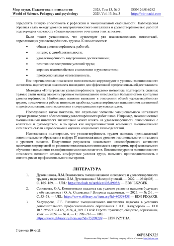 1. Духовникова, Л.М. Взаимосвязь эмоционального интеллекта и удовлетворенности трудом у педагогов / Л.М. Духовникова // Молодой ученый. - 2022. - № 8(403). - С. 165-169. - URL: https://moluch.ru/archive/403/89082/. EDN: LKZGEK