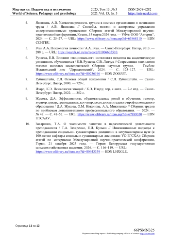 2. Соловьева, О.А. Компетенции педагога как условие развития навыков будущего у обучающегося / О. А. Соловьева // Вопросы педагогики. - 2025. - № 2-1. - С. 53-58. - URL: item.asp?id=80358438. EDN: FDQAXB