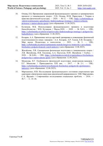 14. Монахова, Е.Г. Особенности физической подготовки спортсменов-танцоров / Е.Г. Монахова // Преподаватель ХХI век. - 2017. - № 2-1. - URL: https://cyberleninka.ru/article/n/osobennosti-fizicheskoy-podgotovki-sportsmenov-tantsorov (дата обращения: 12.06.2025). EDN: YUSGLP