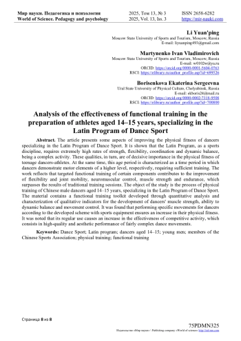 В статье представлены некоторые аспекты повышения физической подготовленности танцоров, специализирующихся на латиноамериканской программе танцевального спорта. Показано, латиноамериканская программа, как спортивная дисциплина, требует чрезвычайно высоких показателей проявления силы, гибкости, координации и динамического равновесия, являясь сложной деятельностью. Эти качества, в свою очередь, имеют решающее значение в физической подготовленности танцоров-спортсменов подросткового возраста. При этом, данный возрастной период охарактеризован как временной промежуток, в котором танцоры демонстрируют двигательные элементы более высокого уровня, соответственно, требующие достаточной подготовленности. В работе отражено, что целенаправленный функциональный тренинг определенных компонентов способствует улучшению гибкости и подвижности суставов, нервно-мышечного контроля, мышечной силы и выносливости, в чем превосходит результаты традиционных учебно-тренировочных занятий. В качестве объекта исследования рассматривается процесс физической подготовки китайских танцоров мужского пола 14-15 лет, специализирующихся на латиноамериканской программе танцевального спорта. В материале содержится разработанный посредством количественного анализа и характеристики качественных показателей инструментарий функциональной тренировки для развития мышечной силы танцоров, способности к динамическому балансу и управлению движением. Выявлено, что выполнение специфических для танцоров движений по разработанной схеме со спортивным инвентарем, обеспечивает прирост их физической подготовленности. Отмечено, что его регулярное применение обуславливает повышение результативности соревновательной деятельности, которая заключается в качественном и эстетичном исполнении достаточно сложных танцевальных движений.