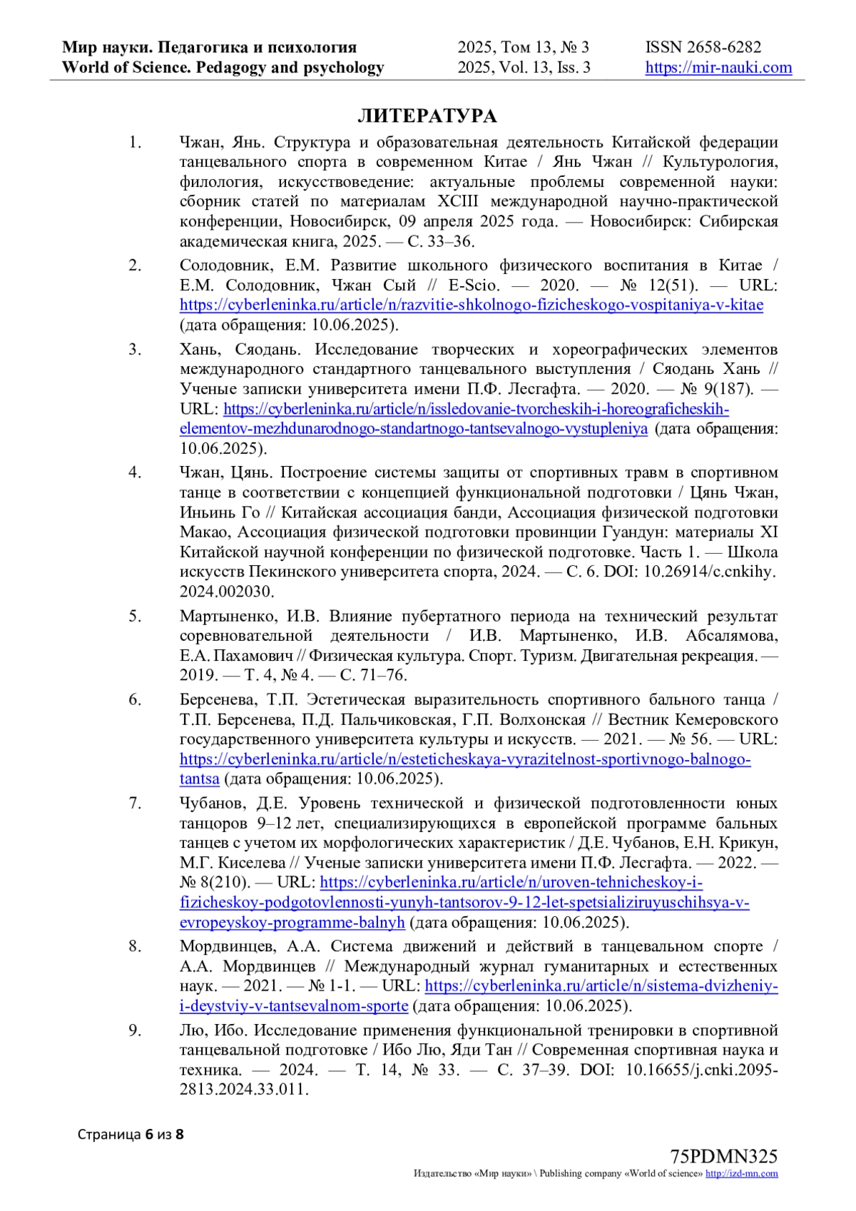 1. Чжан, Янь. Структура и образовательная деятельность Китайской федерации танцевального спорта в современном Китае / Янь Чжан // Культурология, филология, искусствоведение: актуальные проблемы современной науки: сборник статей по материалам XCIII международной научно-практической конференции, Новосибирск, 09 апреля 2025 года. - Новосибирск: Сибирская академическая книга, 2025. - С. 33-36. EDN: KLLTMU
