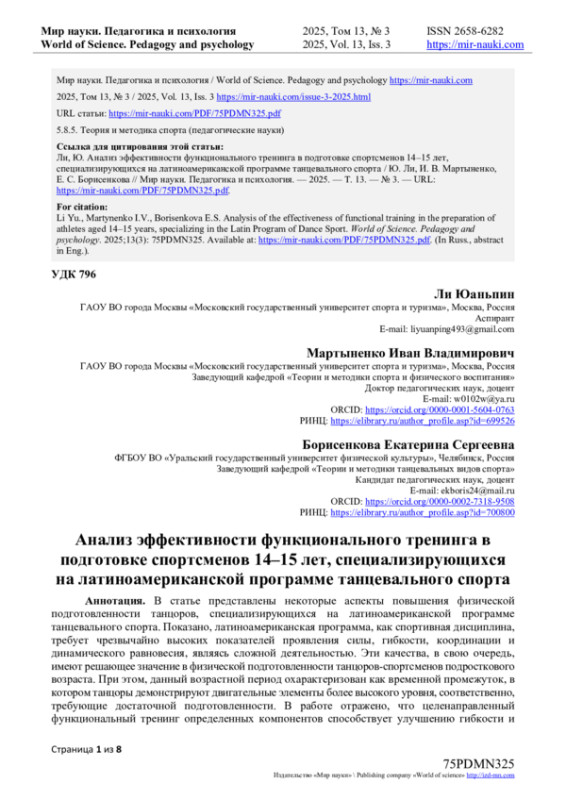 9. Лю, Ибо. Исследование применения функциональной тренировки в спортивной танцевальной подготовке / Ибо Лю, Яди Тан // Современная спортивная наука и техника. - 2024. - Т. 14, № 33. - С. 37-39. DOI: 10.16655/j.cnki.2095-2813.2024.33.011