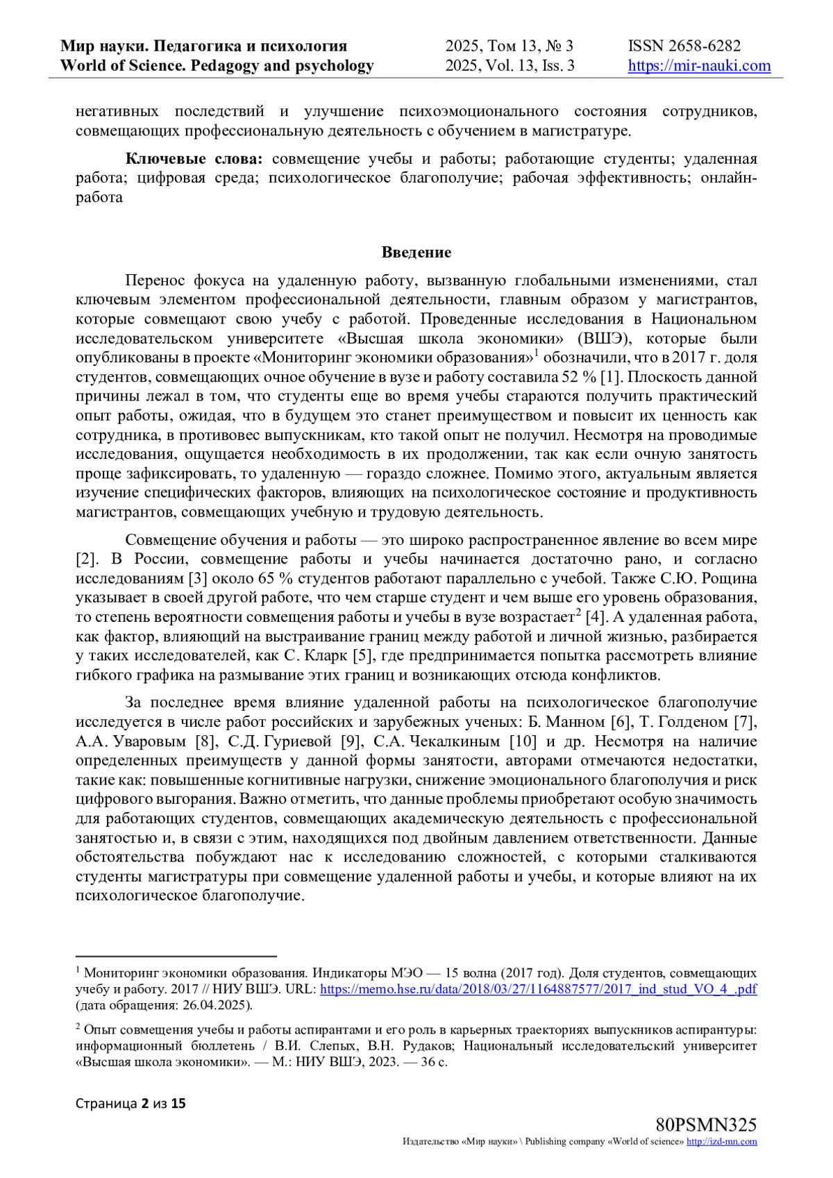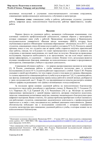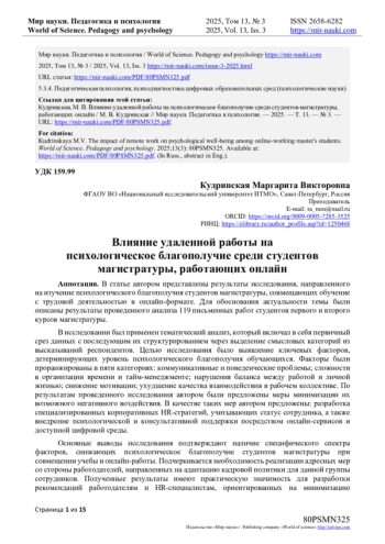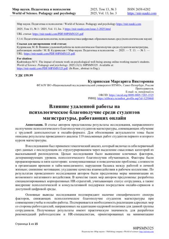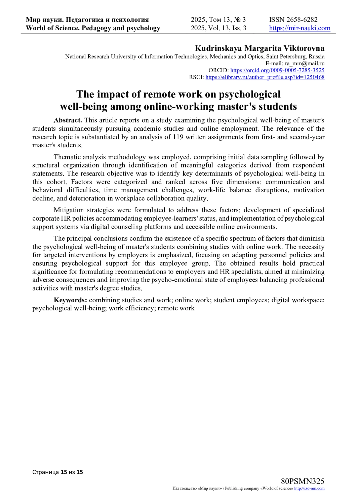 Целью исследования было выявление ключевых факторов, детерминирующих уровень психологического благополучия обучающихся. Факторы были проранжированы в пяти категориях: коммуникативные и поведенческие проблемы; сложности в организации времени и тайм-менеджменте; нарушения баланса между работой и личной жизнью; снижение мотивации; ухудшение качества взаимодействия в рабочем коллективе. По результатам проведенного исследования автором были предложены меры минимизации их возможного негативного воздействия. В качестве таких мер автором предложены: разработка специализированных корпоративных HR-стратегий, учитывающих статус сотрудника, а также внедрение психологической и консультативной поддержки посредством онлайн-сервисов и доступной цифровой среды.