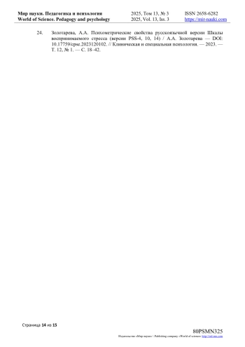 24. Золотарева, А.А. Психометрические свойства русскоязычной версии Шкалы воспринимаемого стресса (версии PSS-4, 10, 14) / А.А. Золотарева - // Клиническая и специальная психология. - 2023. - Т. 12, № 1. - С. 18-42. DOI: 10.17759/cpse.2023120102 EDN: DTPXTQ