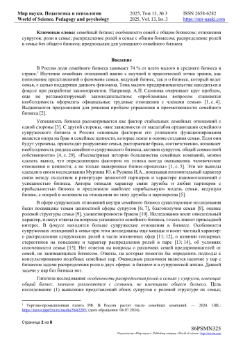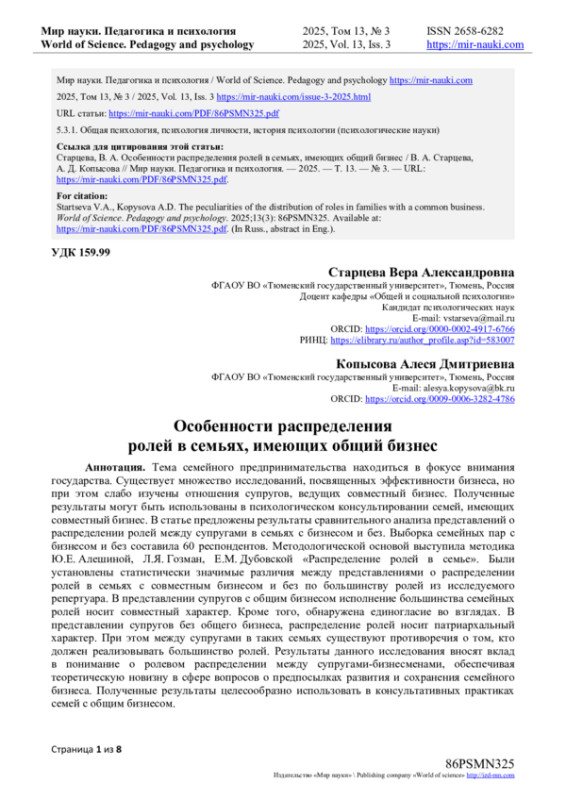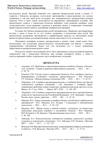 15. Мурзина, Ю.С. Тип семейных отношений у предпринимателей сферы малого семейного бизнеса // Ю.С. Мурзина, И.А. Русяева // Национальный психологический журнал. - 2022. - № 1(45). - С. 30-42. EDN: WMUDZX