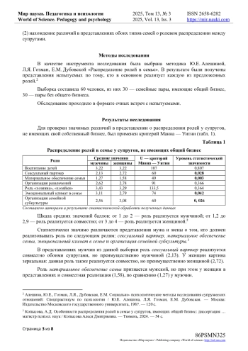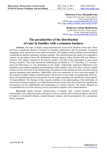 Тема семейного предпринимательства находиться в фокусе внимания государства. Существует множество исследований, посвященных эффективности бизнеса, но при этом слабо изучены отношения супругов, ведущих совместный бизнес. Полученные результаты могут быть использованы в психологическом консультировании семей, имеющих совместный бизнес. В статье предложены результаты сравнительного анализа представлений о распределении ролей между супругами в семьях с бизнесом и без. Выборка семейных пар с бизнесом и без составила 60 респондентов. Методологической основой выступила методика Ю. Е. Алешиной, Л. Я. Гозман, Е. М. Дубовской «Распределение ролей в семье». Были установлены статистически значимые различия между представлениями о распределении ролей в семьях с совместным бизнесом и без по большинству ролей из исследуемого репертуара. В представлении супругов с общим бизнесом исполнение большинства семейных ролей носит совместный характер. Кроме того, обнаружена единогласие во взглядах. В представлении супругов без общего бизнеса, распределение ролей носит патриархальный характер. При этом между супругами в таких семьях существуют противоречия о том, кто должен реализовывать большинство ролей.