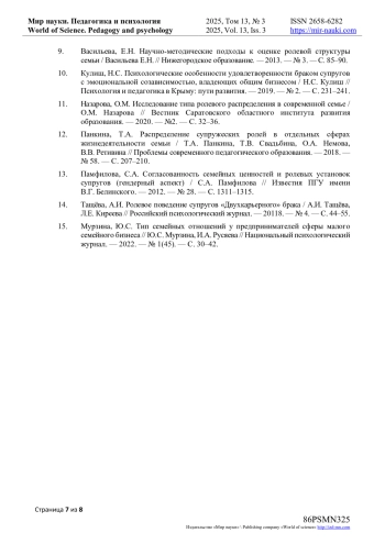 11. Назарова, О.М. Исследование типа ролевого распределения в современной семье / О.М. Назарова // Вестник Саратовского областного института развития образования. - 2020. - №2. - С. 32-36. EDN: HEVUKR