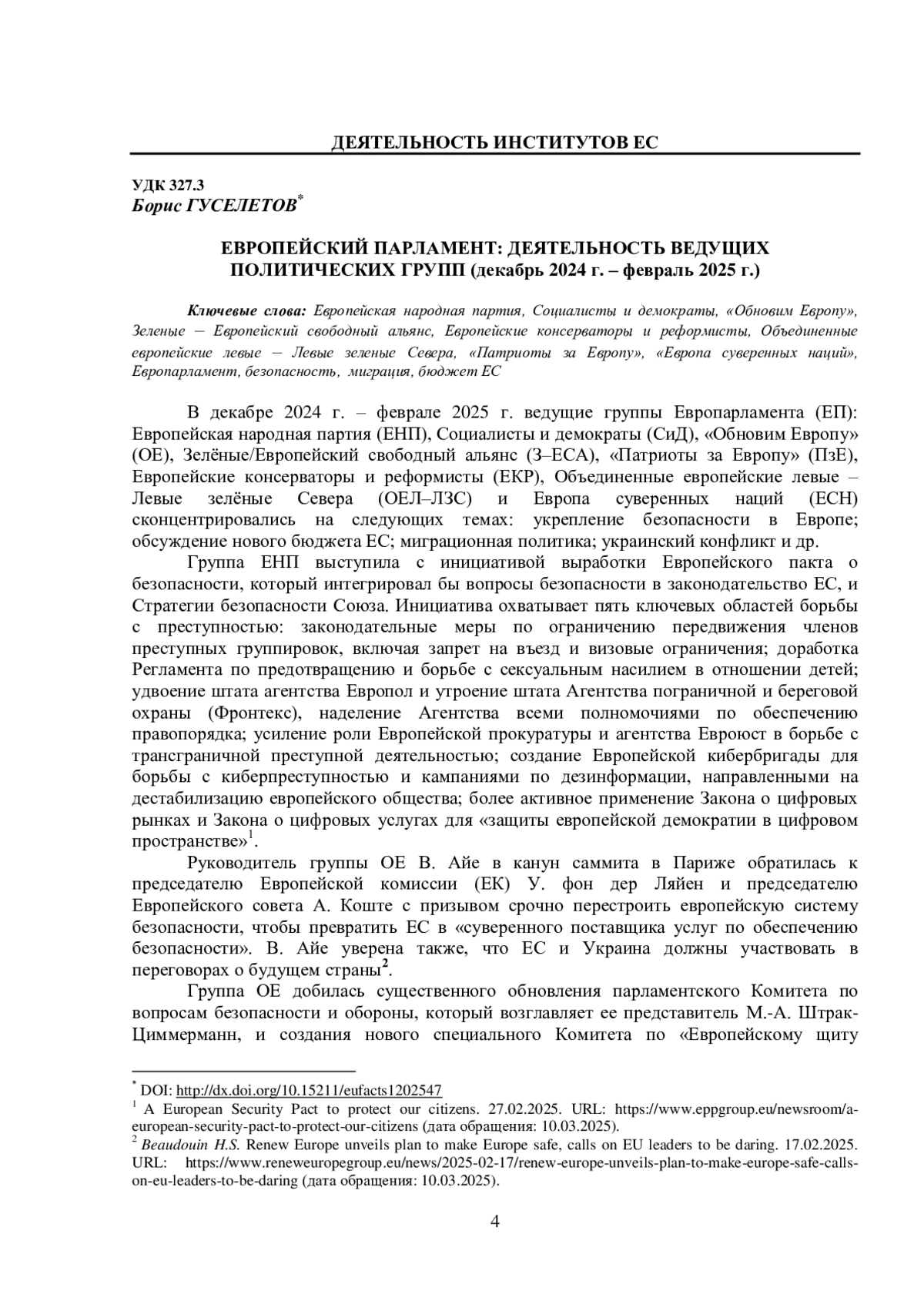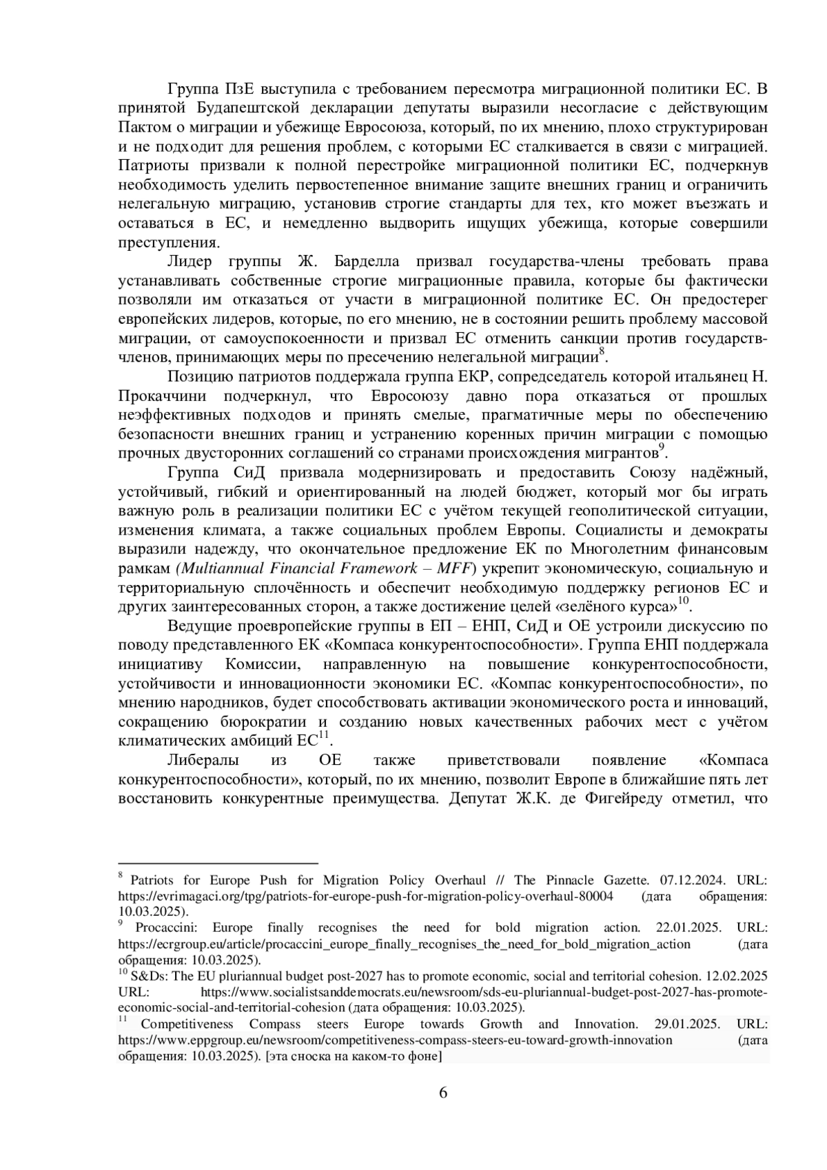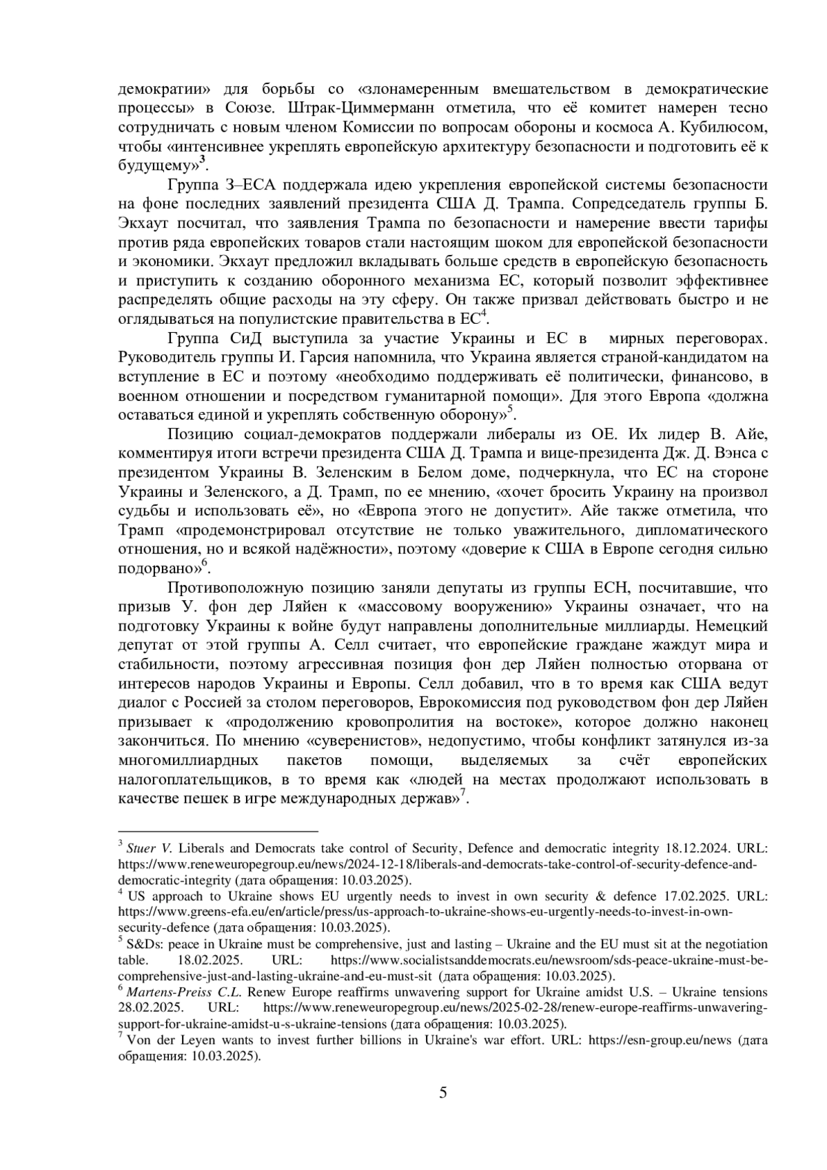 В декабре 2024 г. – феврале 2025 г. ведущие группы Европарламента (ЕП): Европейская народная партия (ЕНП), Социалисты и демократы (СиД), «Обновим Европу» (ОЕ), Зелёные/Европейский свободный альянс (З–ЕСА), «Патриоты за Европу» (ПзЕ), Европейские консерваторы и реформисты (ЕКР), Объединенные европейские левые – Левые зелёные Севера (ОЕЛ–ЛЗС) и Европа суверенных наций (ЕСН) сконцентрировались на следующих темах: укрепление безопасности в Европе; обсуждение нового бюджета ЕС; миграционная политика; украинский конфликт и др
